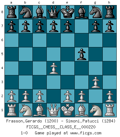 Last move : 1-0 2019 May 8 7:33:22 [Event "FICGS__CHESS__CLASS_E__000220"] [Site "FICGS"] [Date "2019.03.12"] [Round "1"] [White "Frasson,Gerardo"] [Black "Simoni,Patucci"] [Result "1-0"] [WhiteElo "1200"] [BlackElo "1284"] 1.d4 f5 2.g3 1-0 This chess game has been lost on time (started : 2019.03.12 23:12:11) Dutch defense Player White won this chess game. Follow this game move after move (download)When you see a good move, look for a better one. (Emanuel Lasker) Der Freibauer hat für mich eine Seele, genau wie der Mensch, Wünsche, die unerkannt in ihm schlummern, und Befürchtungen, von deren Existenz er selbst kaum ahnt. (Aaron Nimzowitsch) Cuando estes solo, cuando te sientas un extraño en el mundo, juega al Ajedrez. Esto levantará tu espiritu y será tu consejero de guerra. (Aristóteles) On est toujours la mazette de quelqu'un d'autre. (Anonyme) Always two there are. No more no less. A master, and an apprentice. (Master Yoda in Star Wars ep.1)