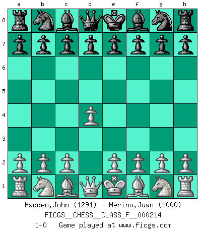 Last move : 1-0 2019 April 23 6:6:11 [Event "FICGS__CHESS__CLASS_F__000214"] [Site "FICGS"] [Date "2019.03.12"] [Round "1"] [White "Hadden,John"] [Black "Merino,Juan"] [Result "1-0"] [WhiteElo "1291"] [BlackElo "1000"] 1.d4 1-0 This chess game has been lost on time (started : 2019.03.12 23:13:34) Queen's pawn Player White won this chess game. Follow this game move after move (download)In blitz, the Knight is stronger than the Bishop. (Vlastimil Hort) Ich spiele ehrlich und spiele, um zu gewinnen. Wenn ich verliere nehme ich meine Medizin. (Robert James Fischer) El Ajedrez detiene a su maestro dentro de sus propios vínculos, encadenando la mente y el cerebro, por lo que la libertad interior del mas fuerte debe sufrir. (Albert Einstein) La solitude du joueur d'Echecs à l'approche du mat est semblable à celle du condamné. (Francis Szpiner) Wawaweewa ! (Borat: Cultural learnings of America for make benefit glorious nation of Kazakhstan)