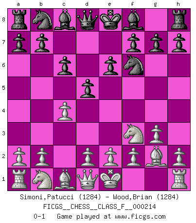 Last move : 0-1 2019 May 7 19:31:25 [Event "FICGS__CHESS__CLASS_F__000214"] [Site "FICGS"] [Date "2019.03.12"] [Round "1"] [White "Simoni,Patucci"] [Black "Wood,Brian"] [Result "0-1"] [WhiteElo "1284"] [BlackElo "1284"] 1.Nf3 Nf6 2.c4 e6 3.g3 d5 4.Bg2 c6 0-1 This chess game has been lost on time (started : 2019.03.12 23:13:34) Reti Opening Player Black won this chess game. Follow this game move after move (download)You sit at the board and suddenly your heart leaps. Your hand trembles to pick up the piece and move it. But what Chess teaches you is that you must sit there calmly and think about whether it's really a good idea and whether there are other better ideas. (Stanley Kubrick) Die Fehler sind da, Sie warten nur darauf gemacht zu werden. (Savielly Grigorievitsch Tartakower) Los Peones son el alma de una partida de Ajedrez. (Francois Andre Danican Philidor) Plusieurs personnes se sont demandées comment Tal faisait pour gagner... En fait, c'est très simple ! Il met ses pièces au centre de l'échiquier et les sacrifie quelque part ! (David Bronstein) The existence of forgetting has never been proved: We only know that some things don't come to mind when we want them. (Friedrich Nietzsche)
