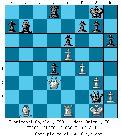 Last move : 0-1 2019 June 8 9:5:32 [Event "FICGS__CHESS__CLASS_F__000214"] [Site "FICGS"] [Date "2019.03.12"] [Round "1"] [White "Piantadosi,Angelo"] [Black "Wood,Brian"] [Result "0-1"] [WhiteElo "1398"] [BlackElo "1284"] 1.d4 d5 2.c4 e6 3.Nc3 Nf6 4.Bg5 Nbd7 5.e3 c6 6.Nf3 Be7 7.Bd3 Qa5 8.O-O dxc4 9.Bxc4 O-O 10.Bh4 h6 11.Rc1 Nd5 12.Bxe7 Nxe7 13.a3 Nf6 14.e4 Rd8 15.Re1 b5 16.Ba2 Bb7 17.e5 Nfd5 18.Nxd5 cxd5 19.Nd2 Nf5 20.f4 Nxd4 21.Nb3 Nxb3 22.Bxb3 Rac8 23.g3 Rxc1 24.Qxc1 b4 25.axb4 Qxb4 26.Ba2 Qd4+ 27.Qe3 Qxb2 28.Bb1 d4 29.Qd3 Qg2+ 0-1 QGD Kingside Castling by player White (move 8) Kingside Castling by player Black (move 9) Player Black won this chess game. Follow this game move after move (download)The isolated Pawn casts gloom over the entire chessboard. (Aaron Nimzovich) Das Schachspiel ist ein See, in welchem eine Mücke baden und ein Elefant ertrinken kann. (Emanuel Lasker) Observen a Garry Kasparov. Después de una derrota, invariablemente el gana la próxima partida. Prácticamente hace pedazos a su siguiente oponente. Eso es algo que tenemos que aprender a lograr. (Maurice Ashley) C'est une question de caractère, Beaucoup de gens perdent leur motivation très vite. D'autres, ils sont rares, peuvent la conserver très longtemps. J'aime les échecs, encore aujourd'hui je suis heureux d'analyser des parties. J'aime toujours gagner, je déteste encore perdre. Bien jouer est important pour mon intégrité intellectuelle et morale. Et puis les échecs vivent en ce moment une période historique grâce à Internet. Ils se développent dans les systèmes éducatifs à travers le monde. Ils sortent de leur ghetto, et c'est mon rôle de mener à bien cette révolution. (Gary Kasparov) If you are good, you will be assigned all the work. If you are really good, you will get out of it. (Dan Rotaru)