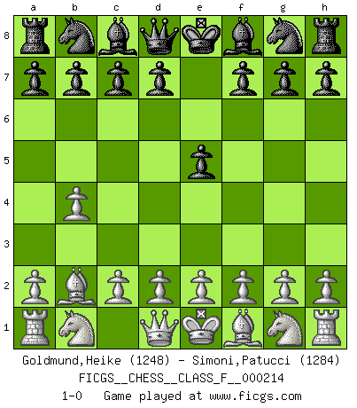 Last move : 1-0 2019 May 8 7:33:22 [Event "FICGS__CHESS__CLASS_F__000214"] [Site "FICGS"] [Date "2019.03.12"] [Round "1"] [White "Goldmund,Heike"] [Black "Simoni,Patucci"] [Result "1-0"] [WhiteElo "1248"] [BlackElo "1284"] 1.b4 e5 2.Bb2 1-0 This chess game has been lost on time (started : 2019.03.12 23:13:34) Polish (Sokolsky) opening Player White won this chess game. Follow this game move after move (download)It is peculiar but a fact nevertheless, that gamblers in chess always have enthusiastic followers. (Botvinnik) Offensichtlich kennt Kasparow nichts anderes als Schach, und ich könnte 500 weitere Spieler dieser Sorte benennen. (Judith Polgar) Los tropiezos estan todos ahí en el tablero, esperando que se cometan. (Savielly Tartakover) Nous vivons dans un monde échiquéen : chaque jour qui passe est un défi à relever. (Philosophe Sasha) We're missing something. (Gregory House, House M.D.)