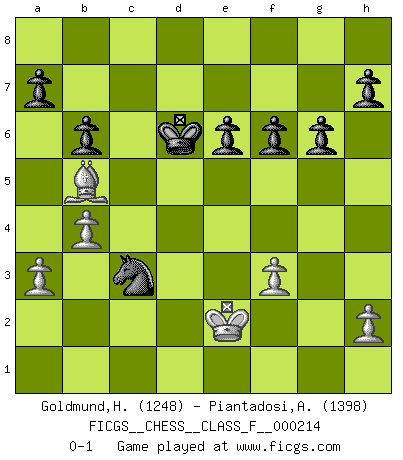 Last move : 0-1 2019 July 2 13:13:53 [Event "FICGS__CHESS__CLASS_F__000214"] [Site "FICGS"] [Date "2019.03.12"] [Round "1"] [White "Goldmund,Heike"] [Black "Piantadosi,Angelo"] [Result "0-1"] [WhiteElo "1248"] [BlackElo "1398"] 1.e4 c5 2.c3 Nc6 3.d4 cxd4 4.cxd4 d6 5.Nf3 Nf6 6.Nc3 e6 7.Bd3 Be7 8.O-O O-O 9.Be3 b6 10.Rc1 Bb7 11.Bc4 Rc8 12.e5 dxe5 13.dxe5 Nd7 14.Nd4 Ndxe5 15.Bb3 Nxd4 16.Qxd4 Qxd4 17.Bxd4 Nd3 18.Rc2 Nf4 19.Rd1 Nxg2 20.Rd3 Nf4 21.Rg3 Nh5 22.Rg4 Bf6 23.Bxf6 Nxf6 24.Rg3 Be4 25.Nxe4 Nxe4 26.Re3 Rxc2 27.Bxc2 Nc5 28.b4 Na6 29.a3 Rc8 30.Re2 Nc7 31.Be4 Nb5 32.Re3 g6 33.Kg2 Rc3 34.Rxc3 Nxc3 35.Bc6 Kf8 36.f3 Ke7 37.Kf2 Nd5 38.Ke2 Kd6 39.Be8 f6 40.Bb5 Nc3+ 0-1 Sicilian : Alapin's variation (2.c3) Kingside Castling by player White (move 8) Kingside Castling by player Black (move 8) Player Black won this chess game. Follow this game move after move (download)I am the best player in the world and I am here to prove it. (Bobby Fischer) Im Fernschach kannst du während dem Spiel rauchen. (John Christen Knudsen) La única cosa que los jugadores de Ajedrez tienen en común, es el Ajedrez. (Lodewijk Prins) On est toujours la mazette de quelqu'un d'autre. (Anonyme) Logic : The art of thinking and reasoning in strict accordance with the limitations and incapacities of the human misunderstanding. (Ambrose Bierce)
