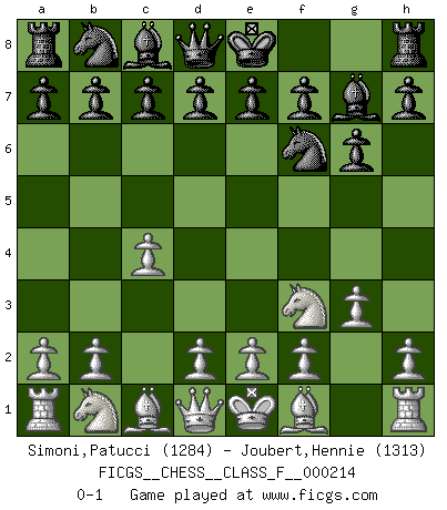 Last move : 0-1 2019 May 10 7:59:10 [Event "FICGS__CHESS__CLASS_F__000214"] [Site "FICGS"] [Date "2019.03.12"] [Round "1"] [White "Simoni,Patucci"] [Black "Joubert,Hennie"] [Result "0-1"] [WhiteElo "1284"] [BlackElo "1313"] 1.Nf3 Nf6 2.c4 g6 3.g3 Bg7 0-1 This chess game has been lost on time (started : 2019.03.12 23:13:34) Reti Opening Player Black won this chess game. Follow this game move after move (download)I don't believe in psychology. I believe in good moves. (Bobby Fischer) Im Spitzenschach von heute geht es nur um Vorbereitung, um tiefgründige, sorgfältige Eröffnungsvorbereitung. (Nigel Short) La mitad de las variaciones que son calculadas en una partida de torneo, resultan ser completamente superfluas. Desafortunadamente, nadie sabe por adelantado cual mitad. (Jan Tinman) La tactique est l'élément le plus important du milieu de jeu. (Siegbert Tarrasch) Players are not good because they find tactics, it is about the way to find the positions in which those tactics are hidden. (Luc-Olivier Leclerc)