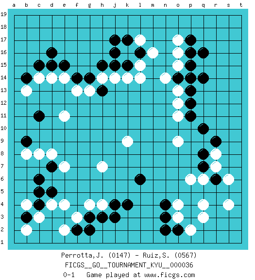 Last move : 0-1 2007 September 22 3:21:4 [Event "FICGS__GO__TOURNAMENT_KYU__000036"] [Site "FICGS"] [Date "2007.06.06"] [Round "1"] [Black "Perrotta,John Zach"] [White "Ruiz,Sebastian"] [Result "0-1"] [Rating 1 "0147"] [Rating 2 "0567"] 1.q16 d4 2.d16 q4 3.r6 o4 4.c6 c8 5.c4 c3 6.d5 e4 7.g3 f3 8.k4 g4 9.h3 h4 10.j4 e7 11.j17 c14 12.c15 d14 13.d15 e14 14.e15 s4 15.q10 o17 16.p17 o16 17.p16 o15 18.p15 r8 19.q8 r7 20.c11 e11 21.b9 b8 22.b3 b4 23.c5 b2 24.n4 o3 25.n3 p6 26.q7 q6 27.d7 d8 28.f14 f13 29.g14 l17 30.o2 p2 31.n2 q3 32.r9 s6 33.j3 k16 34.j16 g13 35.h13 h14 36.h15 j14 37.j15 k14 38.k15 l15 39.k17 l14 40.l16 m16 41.o14 p14 42.q14 n14 43.p13 o13 44.p14 o12 45.p12 o11 46.p11 o9 47.l6 k9 48.f2 e2 49.g2 h7 50.b14 b13 0-1 This go game has been lost on time (started : 2007.06.06 13:40:50) Here are the names of the openings (joseki) played in the four corners : Corner q4 : q4 r6 Hoshi (Hwajeom, Seongjeom, Xingwei`) 4-4 Point. The star or hoshi (4-4) point, emphasizing influence at the potential expense of territory. Ikken Kakari (Hankan Keolch'im, Yi Gua`jiao~, 1-Space Low Approach). Black 2 is the standard approach move to the 4-4. Corner d4 : d4 c6 Hoshi (Hwajeom, Seongjeom, Xingwei`) 4-4 Point. The star or hoshi (4-4) point, emphasizing influence at the potential expense of territory. Ikken Kakari (Hankan Keolch'im, Yi Gua`jiao~, 1-Space Low Approach). Black 2 is the standard approach move to the 4-4. Corner q16 : q16 o17 Hoshi (Hwajeom, Seongjeom, Xingwei`) 4-4 Point. The star or hoshi (4-4) point, emphasizing influence at the potential expense of territory. Ikken Kakari (Hankan Keolch'im, Yi Gua`jiao~, 1-Space Low Approach). White 2 is the standard approach move to the 4-4. Player White won this Go (weiqi, baduk) game. Follow this game move after move (download)Everything would seem to be possible in Go. Like pulling a rabbit, by a magical move, out of a hat. (Pierre Audouard) They misunderestimated me. (George W. Bush, Bentonville nov. 6, 2000)
