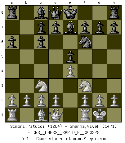 Last move : 0-1 2019 May 7 19:31:25 [Event "FICGS__CHESS__RAPID_E__000225"] [Site "FICGS"] [Date "2019.03.12"] [Round "1"] [White "Simoni,Patucci"] [Black "Sharma,Vivek"] [Result "0-1"] [WhiteElo "1284"] [BlackElo "1471"] 1.e4 e5 2.Nf3 Nc6 3.Bb5 a6 4.Bxc6 bxc6 5.O-O Nf6 6.Nc3 Be7 0-1 This chess game has been lost on time (started : 2019.03.12 23:14:47) Ruy Lopez : Exchange variation Kingside Castling by player White (move 5) Player Black won this chess game. Follow this game move after move (download)A good player is always lucky. (Jose Raul Capablanca) Über Karpov: Er war und ist ein Vertreter der russischen Reaktionäre. Das steckt tief in seiner Seele, wehalb ich nicht nett mit ihm umgehen kann. (Viktor Kortschnoi) En el Ajedrez, tal como es jugado por los Maestros, practicamente la suerte es eliminada. (Emanuel Lasker) Les échecs sont un jeu par leur forme, un art par leur essence et une science par sa difficulté d'acquisition. Ils peuvent vous procurer autant de plaisir qu'un bon livre ou une belle musique, mais vous n'aurez une réelle joie que si vous arrivez à bien jouer. (Tigran Petrosian) You think that education is too expensive ? Try ignorance. (Derek Bok)
