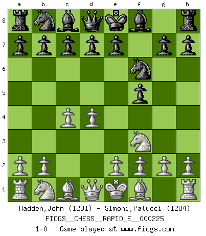 Last move : 1-0 2019 May 5 19:26:47 [Event "FICGS__CHESS__RAPID_E__000225"] [Site "FICGS"] [Date "2019.03.12"] [Round "1"] [White "Hadden,John"] [Black "Simoni,Patucci"] [Result "1-0"] [WhiteElo "1291"] [BlackElo "1284"] 1.d4 f5 2.c4 Nf6 3.Nf3 1-0 This chess game has been lost on time (started : 2019.03.12 23:14:47) Dutch defense Player White won this chess game. Follow this game move after move (download)Chess is a more highly symbolic game, but the aggressions are therefore even more frankly represented in the play. It probably began as a war game; that is, the representation of a miniature battle between the forces of two kingdoms. (Karl Meninger) Dieses schreckliche Gefühl, dass ich gegen eine Maschine spielte, die niemals Fehler macht, zerschmetterte meinen Widerstand. (Mark Taimanov) Yo considero que Fischer es uno de los expertos mas grandes de aperturas de siempre. (Keith Hayward) Je menace de comprendre la position. (Anonyme) There is no instance of a country having benefited from prolonged warfare. (Sun Tzu)