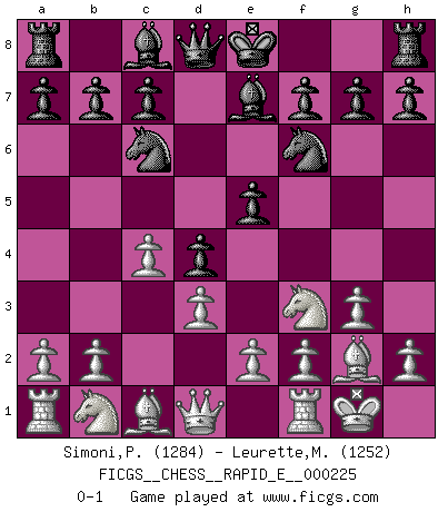 Last move : 0-1 2019 April 23 18:6:48 [Event "FICGS__CHESS__RAPID_E__000225"] [Site "FICGS"] [Date "2019.03.12"] [Round "1"] [White "Simoni,Patucci"] [Black "Leurette,Marc-Antoine"] [Result "0-1"] [WhiteElo "1284"] [BlackElo "1252"] 1.Nf3 d5 2.c4 d4 3.g3 Nc6 4.Bg2 e5 5.d3 Nf6 6.O-O Be7 0-1 This chess game has been lost on time (started : 2019.03.12 23:14:47) Reti : Advance variation Kingside Castling by player White (move 6) Player Black won this chess game. Follow this game move after move (download)The tactician knows what to do when there is something to do; whereas the strategian knows what to do when there is nothing to do. (Gerald Abrahams) Wie gewinnt Tal? Er entwickelt alle seine Figuren in die Brettmitte und opfert sie dann irgendwo. (Robert James Fischer) En un gambito tu regalas un Peón por el bién de tomar un juego perdido. (Samuel Standige Boden) Ne tendez aucun piège pour le plaisir ! Ne jouez rien dans l'espoir que l'adversaire réagisse de façon stupide ! Prenez toujours pour acquis que l'adversaire va trouver le meilleur coup ! Ne jouez jamais de coup dans l'espoir que l'adversaire ne voie pas la menace ! Chacun de vos coups doit améliorer la position d'une façon ou d'une autre. It is a good thing for an uneducated man to read books of quotations. (Winston Churchill)