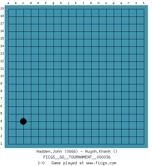 Last move : 1-0 2019 April 13 4:27:22 [Event "FICGS__GO__TOURNAMENT__000036"] [Site "FICGS"] [Date "2019.03.13"] [Round "1"] [Black "Hadden,John"] [White "Huynh,Khanh"] [Result "1-0"] [Rating 1 "0666"] 1.c4 1-0 This go game has been lost on time (started : 2019.03.13 16:46:10) Here are the names of the openings (joseki) played in the four corners : Corner d4 : c4 1-0 Komoku (Somok, Xiao~mu`) 3-4 Point. The komoku (3-4) point is the traditional corner enclosure move.. Player Black won this Go (weiqi, baduk) game. Follow this game move after move (download)You have to like to win, and to learn to recognize the errors that gave you the victory. (Pierre Audouard) The obstacle is the path. (Zen proverb)