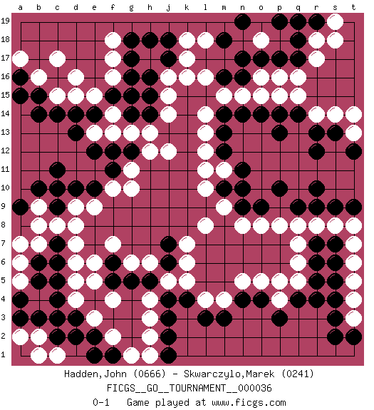 Last move : 0-1 2019 October 21 23:18:22 [Event "FICGS__GO__TOURNAMENT__000036"] [Site "FICGS"] [Date "2019.03.13"] [Round "1"] [Black "Hadden,John"] [White "Skwarczylo,Marek"] [Result "0-1"] [Rating 1 "0666"] [Rating 2 "0241"] 1.c4 q16 2.r4 d16 3.d14 f16 4.c16 r14 5.o4 c17 6.r12 c15 7.c14 b16 8.q17 r17 9.p17 e3 10.d3 f4 11.j4 e13 12.d13 f14 13.d10 d4 14.c3 d5 15.c5 d6 16.c6 d7 17.c7 d9 18.c9 r8 19.r10 p8 20.p10 p16 21.n17 o16 22.o17 j16 23.j17 k17 24.g17 f18 25.g18 f17 26.j18 k18 27.h16 k16 28.h15 j14 29.h14 h13 30.g16 r18 31.q18 j12 32.g14 g13 33.f15 e15 34.g15 j15 35.h18 q5 36.q4 n8 37.n10 l8 38.p13 l10 39.m12 m15 40.m18 l18 41.n19 q19 42.p19 o18 43.n16 n15 44.n14 l4 45.l3 n5 46.n4 m4 47.m3 o5 48.r5 h3 49.j3 h2 50.j2 l12 51.m13 p5 52.r7 p4 53.p3 q7 54.r6 s8 55.s9 t5 56.s7 t7 57.s5 t4 58.s3 c10 59.c11 c8 60.b10 b8 61.r19 e9 62.e10 f7 63.e12 s19 64.q19 s18 65.r13 f10 66.f11 g10 67.f12 f13 68.b14 j5 69.k4 k5 70.e2 f2 71.d2 h4 72.f1 g1 73.e1 t3 74.s2 s14 75.s13 t13 76.t12 t14 77.q14 q15 78.o14 o15 79.e14 m11 80.n11 b9 81.c10 l14 82.m14 l13 83.m10 l11 84.o9 o8 85.q9 q8 86.r9 a5 87.b5 a6 88.a4 b7 89.b6 a7 90.b15 b2 91.b3 a2 92.a3 c1 93.c2 b1 94.j1 d15 95.a16 a17 96.a15 g11 97.g12 h12 98.t2 t6 99.s6 h1 100.s4 t8 101.t9 m9 102.n9 q6 103.m16 l16 104.a9 p15 105.p14 d8 106.h5 h6 107.g5 g6 108.f5 e5 109.j6 k6 110.j7 k7 111.f6 e6 112.pass pass 0-1 Here are the names of the openings (joseki) played in the four corners : Corner d16 : d16 d14 Hoshi (Hwajeom, Seongjeom, Xingwei`) 4-4 Point. The star or hoshi (4-4) point, emphasizing influence at the potential expense of territory. Ikken Takagakari (Hankan Nop'dakeolch'im, Yi Gaojia, 1-Space High Approach). White typically responds at 6-4 or 3-10. White 4-10 is played when White finds play on the right side advantageous. White 4-8 or 3-8 may be played when White has support at top. Corner d4 : c4 e3 Komoku (Somok, Xiao~mu`) 3-4 Point. The komoku (3-4) point is the traditional corner enclosure move.. Ikken Kakari (Hankan Keolch'im, Yi Gua`jiao~, 1-Space Low Pincer). The small knight move is the basic approach move to the 3-4 point stone. It has been continually used for over four centuries. There are limitless variations, with new moves constantly being discovered. White 2 opens the door to a treaure store of joseki. Player White won this Go (weiqi, baduk) game. Follow this game move after move (download)Never try to cut bamboo joints. (Anonymous) Ah, the Socrating method. The best way we have of teaching everything-apart from juggling chainsaws. (Gregory House, House M.D.)