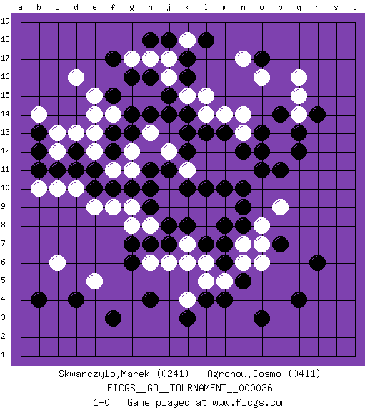 Last move : 1-0 2019 May 24 11:10:16 [Event "FICGS__GO__TOURNAMENT__000036"] [Site "FICGS"] [Date "2019.03.13"] [Round "1"] [Black "Skwarczylo,Marek"] [White "Agronow,Cosmo"] [Result "1-0"] [Rating 1 "0241"] [Rating 2 "0411"] 1.q4 d16 2.d4 q16 3.r6 c6 4.r14 q14 5.q13 p13 6.q12 o6 7.f3 e5 8.p14 q15 9.o13 p12 10.p11 n11 11.o12 m14 12.o3 k4 13.m13 n13 14.n12 n14 15.b4 m12 16.l13 l12 17.k13 h13 18.k12 k11 19.j11 j12 20.k10 l11 21.l10 m11 22.n10 j10 23.h11 l14 24.k14 k15 25.j14 h15 26.m10 d10 27.m4 m5 28.o17 o16 29.j15 j16 30.k16 l15 31.h16 j17 32.h14 g15 33.g14 f14 34.g13 g12 35.f13 e13 36.f12 g11 37.h10 j9 38.f10 f11 39.e11 f9 40.e10 e12 41.o11 m9 42.f15 e14 43.g16 n17 44.d11 e9 45.k17 k18 46.j18 h17 47.h18 g17 48.f17 p9 49.h9 h8 50.j8 k9 51.k8 l9 52.n8 l8 53.l7 k7 54.j7 k6 55.m8 j6 56.h7 g8 57.p7 o7 58.g6 h6 59.g7 k11 60.g10 o8 61.h4 e15 62.d12 g9 63.l18 l6 64.m7 d13 65.k3 c12 66.c11 c10 67.b11 b10 68.b12 c13 69.b13 b14 70.m6 n6 71.n5 l5 72.l4 n7 73.n9 1-0 Here are the names of the openings (joseki) played in the four corners : Corner d4 : d4 c6 Hoshi (Hwajeom, Seongjeom, Xingwei`) 4-4 Point. The star or hoshi (4-4) point, emphasizing influence at the potential expense of territory. Ikken Kakari (Hankan Keolch'im, Yi Gua`jiao~, 1-Space Low Approach). White 2 is the standard approach move to the 4-4. Corner q16 : q16 r14 Hoshi (Hwajeom, Seongjeom, Xingwei`) 4-4 Point. The star or hoshi (4-4) point, emphasizing influence at the potential expense of territory. Ikken Kakari (Hankan Keolch'im, Yi Gua`jiao~, 1-Space Low Approach). Black 2 is the standard approach move to the 4-4. Player Black won this Go (weiqi, baduk) game. Follow this game move after move (download)Don't count territory held by only one eye. (Anonymous) Men never do evil so completely and cheerfully as when they do it from religious conviction. (Blaise Pascal)