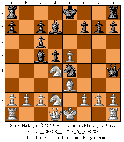 Last move : 0-1 2019 June 21 9:57:11 [Event "FICGS__CHESS__CLASS_A__000208"] [Site "FICGS"] [Date "2019.03.13"] [Round "1"] [White "Sirk,Matija"] [Black "Bukharin,Alexey"] [Result "0-1"] [WhiteElo "2134"] [BlackElo "2057"] 1.e4 e5 2.Bc4 Nf6 3.d4 exd4 4.Nf3 Nc6 5.e5 d5 6.Bb5 Ne4 7.Nxd4 Bc5 8.Be3 Bd7 9.Bxc6 bxc6 10.Nd2 Qh4 0-1 Bishop's Opening : Urusov gambit Player Black won this chess game. Follow this game move after move (download)There are tough players and nice guys, and I'm a tough player. (Bobby Fischer) Es genügt nicht ein guter Spieler zu sein, man muß auch gut spielen. (Siegbert Tarrasch) Una mala movida nulifica cuarenta buenas. (Horowitz) Les échecs, c'est l'art d'analyser. (Mikhail Botvinnik) The leaves of memory seemed to make a mournful rustling in the dark. (Henry Wadsworth Longfellow)