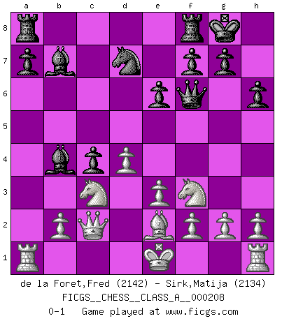 Last move : 0-1 2019 July 7 23:46:35 [Event "FICGS__CHESS__CLASS_A__000208"] [Site "FICGS"] [Date "2019.03.13"] [Round "1"] [White "de la Foret,Fred"] [Black "Sirk,Matija"] [Result "0-1"] [WhiteElo "2142"] [BlackElo "2134"] 1.d4 Nf6 2.c4 e6 3.Nf3 d5 4.Nc3 c6 5.Bg5 h6 6.Bxf6 Qxf6 7.Qc2 dxc4 8.e3 b5 9.a4 Bb7 10.axb5 cxb5 11.Nxb5 Bb4+ 12.Nc3 O-O 13.Be2 Nd7 0-1 Queen's pawn game Kingside Castling by player Black (move 12) Player Black won this chess game. Follow this game move after move (download)All I want to do, ever, is just play Chess. (Bobby Fischer) Kritik überlasse ich den Spießern. Ich zeige nichts, wofür ich mich schämen muss. (Alexandra Kosteniuk) De eso se trata el Ajedrez. Un día le das una lección a tu oponente y al día siguiente el te da una a tí. (Bobby Fischer) Toute estimation doit être constamment réévaluée. (Jacob Estrin) Animated gif is worth one mega-word. (Unknown)