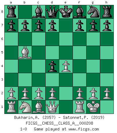 Last move : 1-0 2019 April 24 6:14:36 [Event "FICGS__CHESS__CLASS_A__000208"] [Site "FICGS"] [Date "2019.03.13"] [Round "1"] [White "Bukharin,Alexey"] [Black "Satonnet,Patrick"] [Result "1-0"] [WhiteElo "2057"] [BlackElo "2019"] 1.e4 e5 2.Nf3 Nc6 3.Bb5 Nd4 4.Nxd4 exd4 5.O-O 1-0 This chess game has been lost on time (started : 2019.03.13 23:30:32) Ruy Lopez : Bird's defense Kingside Castling by player White (move 5) Player White won this chess game. Follow this game move after move (download)The chessboard is the world, the pieces are the phenomena of the Universe, the rules of the game are what we call the laws of Nature and the player on the other side is hidden from us. (Thomas Huxley) Der Umstand, daß uns eine 7 Stunden Zeitkontrolle ermöglicht eine großartige, tiefe Partie zu spielen, ist für die Massenmedien nicht weiter von Bedeutung. (Alexej Shirov) Prefiero perder una partida realmente buena, que ganar una mala. (David Levy) Vous n'êtes pas toujours obligé de jouer le meilleur coup. Un coup doit être actif, entreprenant, correct et beau ! (David Bronstein) If you lose the game you should win the analysis! (Proverb)