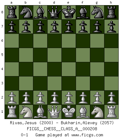 Last move : 0-1 2019 April 23 6:6:11 [Event "FICGS__CHESS__CLASS_A__000208"] [Site "FICGS"] [Date "2019.03.13"] [Round "1"] [White "Rivas,Jesus"] [Black "Bukharin,Alexey"] [Result "0-1"] [WhiteElo "2000"] [BlackElo "2057"] 0-1 This chess game has been lost on time (started : 2019.03.13 23:30:32) Player Black won this chess game. Follow this game move after move (download)Bobby is the finest Chess player this country ever produced. His memory for the moves, his brilliance in dreaming up combinations, and his fierce determination to win are uncanny. (John Collins) Der Traum, für den ich lebe, ist der von einem freien Russland. Viele mögen sagen: Russland hat doch ein Parlament, einen gewählten Präsidenten. Aber ich spüre, dass in meiner Heimat die Angst wiederkehrt. Eine Angst, sich frei zu äußern, bestimmte Dinge zu tun (Garry Kasparov) Sin errores no puede haber brillantez. (Emanuel Lasker) Mais n'est-ce pas déjà le limiter injurieusement que d'appeler les échecs un jeu? N'est-ce pas aussi une science, un art, ou quelque chose qui, comme le cercueil de Mahomet entre ciel et terre, est suspendu entre l'un et l'autre, et qui réunit un nombre incroyable de contraires ? (Stefan Zweig) Computers have lots of memory but no imagination. (Anonymous)