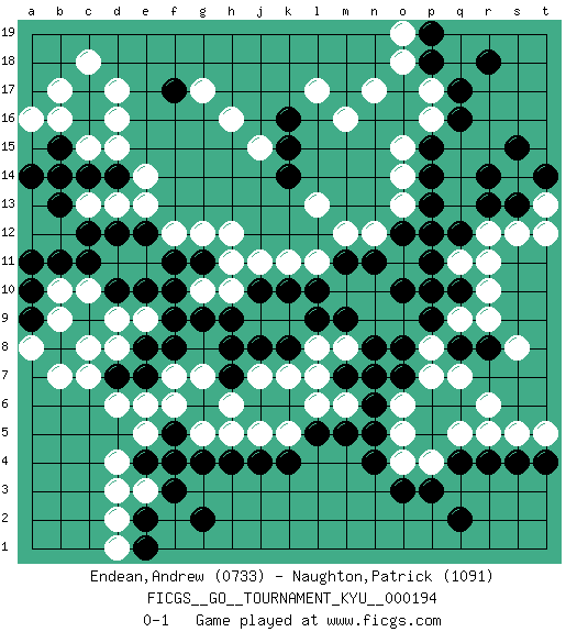 Last move : 0-1 2019 July 16 18:57:5 [Event "FICGS__GO__TOURNAMENT_KYU__000194"] [Site "FICGS"] [Date "2019.03.16"] [Round "1"] [Black "Endean,Andrew"] [White "Naughton,Patrick"] [Result "0-1"] [Rating 1 "0733"] [Rating 2 "1091"] 1.q4 d4 2.q16 d16 3.r14 d13 4.k4 r6 5.o3 r10 6.k16 h16 7.f3 d6 8.d10 b10 9.e8 c8 10.r8 q7 11.q8 p8 12.p9 q9 13.q10 r9 14.o8 p7 15.o10 q11 16.p10 h12 17.c17 d17 18.c16 c15 19.b15 b14 20.c14 d15 21.b13 b16 22.a14 b17 23.d14 e14 24.c12 m16 25.k14 p17 26.q17 p16 27.p15 o15 28.p14 o14 29.p13 o13 30.p12 l13 31.o12 n12 32.n11 m12 33.m11 l11 34.l10 k11 35.k10 j11 36.j10 h10 37.h9 g10 38.g9 g5 39.f5 f6 40.g4 h5 41.h4 j5 42.j8 e5 43.f4 d3 44.p18 o18 45.p19 o19 46.r18 n17 47.o7 o6 48.n6 o5 49.n5 o4 50.n4 p4 51.p3 q5 52.r4 r5 53.s4 s5 54.t4 t5 55.q2 s8 56.b11 c10 57.c11 d9 58.e10 r12 59.r13 s12 60.s13 c18 61.f9 l6 62.l5 k5 63.m5 k7 64.k8 l8 65.l9 m8 66.m9 f12 67.f10 g7 68.e7 e6 69.e2 d2 70.e1 d1 71.j4 j7 72.q12 r11 73.p11 j15 74.k15 l17 75.a10 b9 76.a9 a8 77.a11 b7 78.g11 h11 79.f11 g12 80.e12 e13 81.d12 c13 82.b14 d8 83.d7 c7 84.n8 m6 85.m7 l7 86.n7 t13 87.t14 t12 88.s15 e3 89.g2 e9 90.f8 f7 91.h7 h6 92.h8 a16 93.f17 g17 94.e4 pass 95.pass pass 96.pass pass 0-1 Here are the names of the openings (joseki) played in the four corners : Corner q4 : q4 r6 Hoshi (Hwajeom, Seongjeom, Xingwei`) 4-4 Point. The star or hoshi (4-4) point, emphasizing influence at the potential expense of territory. Ikken Kakari (Hankan Keolch'im, Yi Gua`jiao~, 1-Space Low Approach). White 2 is the standard approach move to the 4-4. Corner d4 : d4 f3 Hoshi (Hwajeom, Seongjeom, Xingwei`) 4-4 Point. The star or hoshi (4-4) point, emphasizing influence at the potential expense of territory. Ikken Kakari (Hankan Keolch'im, Yi Gua`jiao~, 1-Space Low Approach). Black 2 is the standard approach move to the 4-4. Player White won this Go (weiqi, baduk) game. Follow this game move after move (download)Go is not a blocking game, it's a game of action. (Pierre Audouard) My poor ole parrot... Is not in the circulation of displays ....poo hoo hoo :) (Wayne Lowrance's enigma)