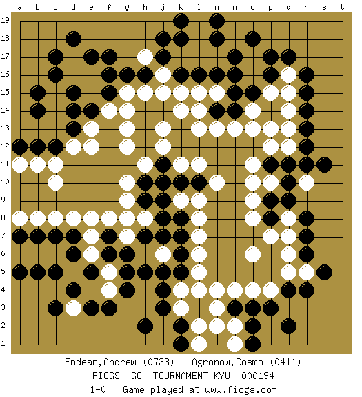 Last move : 1-0 2019 October 11 23:0:52 [Event "FICGS__GO__TOURNAMENT_KYU__000194"] [Site "FICGS"] [Date "2019.03.16"] [Round "1"] [Black "Endean,Andrew"] [White "Agronow,Cosmo"] [Result "1-0"] [Rating 1 "0733"] [Rating 2 "0411"] 1.q4 d16 2.d4 q16 3.r6 c6 4.f3 f5 5.r14 p12 6.p14 o14 7.o15 p15 8.p16 q15 9.n16 q14 10.n14 p13 11.f17 o6 12.o3 k15 13.h16 g14 14.c17 d17 15.c16 c10 16.d15 e15 17.d14 e12 18.q10 p10 19.p9 o9 20.p8 o8 21.p11 o11 22.q11 o10 23.r13 q13 24.r12 k3 25.c3 q7 26.r7 q8 27.q9 p7 28.r8 m17 29.n17 m13 30.m14 l14 31.p17 h17 32.g16 l15 33.q17 m3 34.d13 d12 35.c12 c11 36.b12 b11 37.b15 p4 38.p3 o4 39.j14 j12 40.h12 h11 41.h13 j13 42.d18 e16 43.e17 j15 44.d6 d8 45.e5 e6 46.f6 e7 47.g5 h6 48.h5 j5 49.j4 j6 50.j3 k4 51.k2 l2 52.k1 l1 53.h2 e13 54.e14 f14 55.h14 h15 56.f15 g15 57.f16 j16 58.j17 k17 59.j18 g12 60.k18 l18 61.m16 m15 62.n15 n13 63.l16 l13 64.k16 l17 65.m18 l19 66.m19 g13 67.g6 g7 68.f7 f8 69.d7 e8 70.c7 c8 71.b7 b8 72.a7 a8 73.c5 q5 74.r4 r5 75.s5 q6 76.r16 q12 77.n3 n4 78.q2 n2 79.o2 m2 80.h7 g8 81.j8 k9 82.k8 l8 83.r15 o13 84.a12 a11 85.b14 k14 86.o1 n1 87.k5 l5 88.k6 l6 89.k7 h8 90.j7 l7 91.j9 j10 92.h9 g9 93.h10 g10 94.k10 l9 95.j11 l11 96.l10 m10 97.o18 m4 98.s11 k11 99.j10 j6 100.j5 r10 101.r11 l4 102.k19 b6 103.b5 f4 104.g4 d3 105.e3 a6 106.a5 1-0 Here are the names of the openings (joseki) played in the four corners : Corner d4 : d4 c6 Hoshi (Hwajeom, Seongjeom, Xingwei`) 4-4 Point. The star or hoshi (4-4) point, emphasizing influence at the potential expense of territory. Ikken Kakari (Hankan Keolch'im, Yi Gua`jiao~, 1-Space Low Approach). White 2 is the standard approach move to the 4-4. Corner q16 : q16 r14 Hoshi (Hwajeom, Seongjeom, Xingwei`) 4-4 Point. The star or hoshi (4-4) point, emphasizing influence at the potential expense of territory. Ikken Kakari (Hankan Keolch'im, Yi Gua`jiao~, 1-Space Low Approach). Black 2 is the standard approach move to the 4-4. Corner d16 : d16 f17 Hoshi (Hwajeom, Seongjeom, Xingwei`) 4-4 Point. The star or hoshi (4-4) point, emphasizing influence at the potential expense of territory. Ikken Kakari (Hankan Keolch'im, Yi Gua`jiao~, 1-Space Low Approach). Black 2 is the standard approach move to the 4-4. Player Black won this Go (weiqi, baduk) game. Follow this game move after move (download)Five liberties for tactical stability. (Anonymous) I take risks, sometimes patients die, but not taking risks causes more patients to die. So I guess my biggest problem is I've been cursed with the ability to do the math. (Gregory House, House M.D.)