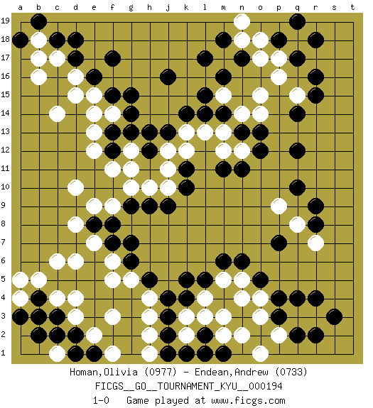 Last move : 1-0 2019 June 26 20:40:5 [Event "FICGS__GO__TOURNAMENT_KYU__000194"] [Site "FICGS"] [Date "2019.03.16"] [Round "1"] [Black "Homan,Olivia"] [White "Endean,Andrew"] [Result "1-0"] [Rating 1 "0977"] [Rating 2 "0733"] 1.r16 d4 2.q4 d16 3.f17 c14 4.l17 d10 5.q10 c6 6.k4 p17 7.q17 p16 8.q14 o14 9.n17 o15 10.q12 m13 11.j16 r3 12.r4 q3 13.p3 p2 14.o2 o3 15.p4 n2 16.q2 o1 17.r2 o4 18.o5 n5 19.n6 m5 20.m6 l4 21.k5 k3 22.j3 k2 23.l5 m3 24.m11 k12 25.k10 j10 26.j9 h10 27.k11 j12 28.f15 e13 29.d18 c17 30.h9 g10 31.g9 f9 32.f8 e9 33.o12 f5 34.g7 e7 35.c3 d3 36.d2 e2 37.b2 c4 38.b4 b5 39.a3 a5 40.e1 f1 41.d1 f3 42.c18 b18 43.d17 b16 44.e16 d15 45.f13 e12 46.f12 f11 47.h12 g12 48.g13 g11 49.h13 l13 50.n13 n14 51.l15 j11 52.m14 m15 53.l14 e14 54.j13 k13 55.k14 q8 56.r8 r7 57.r9 a4 58.b3 c1 59.c2 p9 60.p7 n12 61.o13 m12 62.n11 h4 63.j4 h3 64.j2 h2 65.k1 l1 66.j1 h1 67.h5 g5 68.g6 f6 69.e8 d8 70.f7 d6 71.b19 a19 72.a18 b17 73.l2 l3 74.m1 m2 75.l1 n4 76.s3 f14 77.g14 e15 78.g15 q18 79.r18 n18 80.m16 o17 81.m18 n19 82.p18 o18 83.q19 q15 84.r15 1-0 Here are the names of the openings (joseki) played in the four corners : Corner d16 : d16 f17 Hoshi (Hwajeom, Seongjeom, Xingwei`) 4-4 Point. The star or hoshi (4-4) point, emphasizing influence at the potential expense of territory. Ikken Kakari (Hankan Keolch'im, Yi Gua`jiao~, 1-Space Low Approach). Black 2 is the standard approach move to the 4-4. Corner q4 : q4 r3 Hoshi (Hwajeom, Seongjeom, Xingwei`) 4-4 Point. The star or hoshi (4-4) point, emphasizing influence at the potential expense of territory. Player Black won this Go (weiqi, baduk) game. Follow this game move after move (download)The carpenter's square becomes ko. (Anonymous) First of all, we have to go back to the classical time control. (Anatoly Karpov)