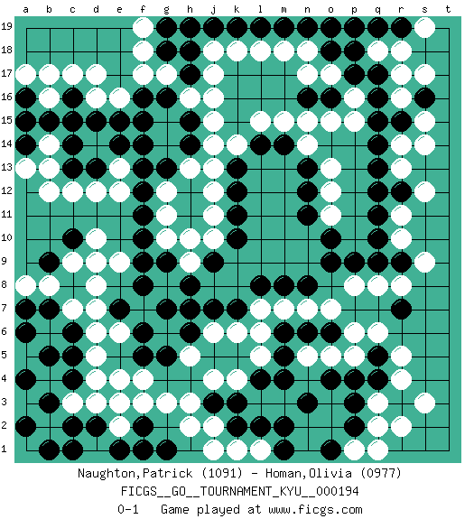Last move : 0-1 2019 April 6 7:3:20 [Event "FICGS__GO__TOURNAMENT_KYU__000194"] [Site "FICGS"] [Date "2019.03.16"] [Round "1"] [Black "Naughton,Patrick"] [White "Homan,Olivia"] [Result "0-1"] [Rating 1 "1091"] [Rating 2 "0977"] 1.q16 d17 2.q4 d4 3.q10 o17 4.d15 d12 5.c16 c17 6.c13 c12 7.f16 f18 8.h17 g17 9.g16 h16 10.h15 j16 11.q14 j15 12.h14 j14 13.f14 h13 14.g13 g12 15.f12 g11 16.f11 g10 17.f10 d9 18.g9 j12 19.f8 d7 20.n3 r4 21.r3 r5 22.r7 q3 23.p3 q2 24.p4 s3 25.p2 r2 26.j3 b13 27.c14 e9 28.f9 e13 29.f13 g3 30.j7 j4 31.k3 h3 32.j9 k4 33.l4 l5 34.m4 k6 35.k7 l7 36.l8 m7 37.m8 n7 38.n8 o15 39.k13 j13 40.n13 o13 41.n12 o12 42.n11 n14 43.q12 r17 44.q17 q18 45.p18 r18 46.p17 s15 47.s16 r16 48.r15 s14 49.m19 n18 50.n19 o19 51.o18 m18 52.l19 l18 53.k19 k18 54.j19 j18 55.p19 h19 56.o19 r13 57.q13 r11 58.q11 r10 59.r9 s9 60.c4 c3 61.c5 d5 62.c6 d6 63.b3 b2 64.c2 d3 65.a2 b4 66.b1 c7 67.b5 b6 68.a4 r8 69.q9 q8 70.b7 b8 71.a6 b14 72.b15 b17 73.f5 f4 74.g5 h5 75.h6 j6 76.h7 f7 77.g7 j2 78.k2 h2 79.d2 e2 80.m14 m15 81.l14 l15 82.k12 j11 83.k11 p8 84.o9 j10 85.k10 p6 86.o6 o7 87.m5 o5 88.n6 p5 89.o4 k1 90.l2 l1 91.m2 n5 92.m6 l6 93.c10 d10 94.c8 c9 95.b9 a8 96.a7 d8 97.e7 e6 98.f6 o11 99.o16 n17 100.n16 n15 101.o10 p15 102.q15 p16 103.q19 s17 104.r19 s19 105.g18 f17 106.h18 e16 107.f15 f19 108.g19 j17 109.h19 b16 110.a15 d16 111.c15 b12 112.a16 a17 113.e15 k14 114.r12 s12 115.m1 j1 116.e1 f1 117.f2 d1 118.e3 f3 119.e1 e4 120.g1 e2 121.c1 e3 122.f1 p1 123.o1 q1 124.q5 q6 125.d13 e12 126.e14 h9 127.h8 h10 128.p9 r14 129.a14 a13 0-1 Here are the names of the openings (joseki) played in the four corners : Corner q16 : q16 o17 Hoshi (Hwajeom, Seongjeom, Xingwei`) 4-4 Point. The star or hoshi (4-4) point, emphasizing influence at the potential expense of territory. Ikken Kakari (Hankan Keolch'im, Yi Gua`jiao~, 1-Space Low Approach). White 2 is the standard approach move to the 4-4. Corner d16 : d17 d15 Komoku (Somok, Xiao~mu`) 3-4 Point. The komoku (3-4) point is the traditional corner enclosure move.. Ikken Takagakari (Hankan Nop'dakeolch'im, Yi Gaogua`jiao~, 1-Space High Approach). The 5-4 approach move has become more popular in modern times, as modern Go emphasizes speed and influence. Player White won this Go (weiqi, baduk) game. Follow this game move after move (download)Don't reduce your own liberties. (Bill Taylor) Memory is a crazy woman that hoards colored rags and throws away food. (Austin O'Malley)