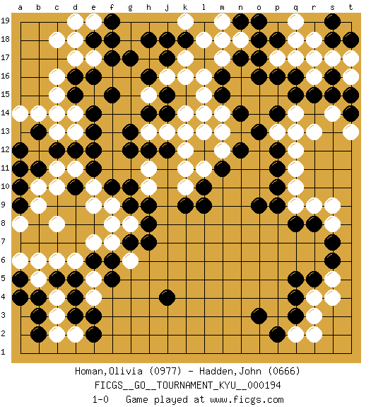 Last move : 1-0 2019 July 13 17:36:52 [Event "FICGS__GO__TOURNAMENT_KYU__000194"] [Site "FICGS"] [Date "2019.03.16"] [Round "1"] [Black "Homan,Olivia"] [White "Hadden,John"] [Result "1-0"] [Rating 1 "0977"] [Rating 2 "0666"] 1.d3 r16 2.q4 c16 3.c5 r4 4.r5 r3 5.q3 q2 6.p2 r2 7.q5 s5 8.s6 s4 9.o3 k16 10.j4 q10 11.p16 p17 12.o17 q17 13.o16 m17 14.r15 r13 15.s16 s17 16.q16 r17 17.s15 c8 18.p18 q18 19.o18 t16 20.t15 t17 21.s18 r18 22.s19 c6 23.d5 b5 24.b4 b6 25.e16 e17 26.f17 d17 27.h16 h17 28.g17 d13 29.j17 k17 30.h18 l14 31.o13 p13 32.p12 q12 33.p14 q13 34.p11 q11 35.r8 r9 36.q8 s8 37.s7 s9 38.o9 f8 39.h8 h10 40.g9 f9 41.g10 h11 42.f10 e10 43.e11 d11 44.d10 e9 45.d12 c11 46.e12 c13 47.c12 b12 48.b11 c10 49.b13 b14 50.a12 b10 51.e13 d14 52.e14 e15 53.d15 c14 54.f15 c15 55.k9 k10 56.l10 k11 57.l9 l11 58.m11 m12 59.n12 m13 60.n14 m14 61.m15 l15 62.m16 l16 63.n17 m18 64.k18 l18 65.k13 j13 66.j14 k14 67.j12 h13 68.h12 k12 69.g12 l13 70.f6 d6 71.e6 e7 72.g7 f7 73.a4 g8 74.h9 h15 75.j15 j16 76.h14 k19 77.j18 n18 78.n19 m19 79.o19 q19 80.t18 q14 81.q15 s14 82.t14 t13 83.g13 k13 84.a10 b9 85.a9 a8 86.a11 a14 87.d16 c18 88.e18 d18 89.f18 e19 90.f19 d19 91.a5 a6 92.p10 q9 93.p9 g6 94.h7 e5 95.f5 c4 96.d4 c3 97.b3 c2 98.b2 d2 99.e2 e4 100.e3 1-0 Here are the names of the openings (joseki) played in the four corners : Corner q4 : q4 r4 Hoshi (Hwajeom, Seongjeom, Xingwei`) 4-4 Point. The star or hoshi (4-4) point, emphasizing influence at the potential expense of territory. Corner q16 : r16 p16 Komoku (Somok, Xiao~mu`) 3-4 Point. The komoku (3-4) point is the traditional corner enclosure move.. Ikken Takagakari (Hankan Nop'dakeolch'im, Yi Gaogua`jiao~, 1-Space High Approach). The 5-4 approach move has become more popular in modern times, as modern Go emphasizes speed and influence. Corner d16 : c16 e16 Komoku (Somok, Xiao~mu`) 3-4 Point. The komoku (3-4) point is the traditional corner enclosure move.. Ikken Takagakari (Hankan Nop'dakeolch'im, Yi Gaogua`jiao~, 1-Space High Approach). The 5-4 approach move has become more popular in modern times, as modern Go emphasizes speed and influence. Player Black won this Go (weiqi, baduk) game. Follow this game move after move (download)Attach to the strongest stone in a pincer. (Anonymous) The ego is not master in its own house. (Sigmund Freud)