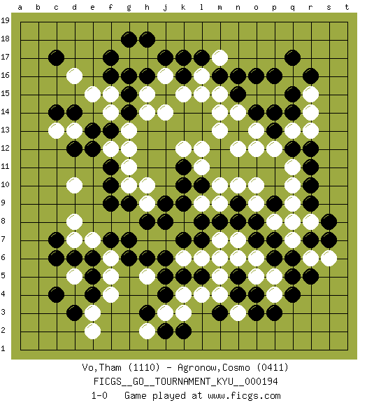 Last move : 1-0 2019 May 2 2:45:15 [Event "FICGS__GO__TOURNAMENT_KYU__000194"] [Site "FICGS"] [Date "2019.03.16"] [Round "1"] [Black "Vo,Tham"] [White "Agronow,Cosmo"] [Result "1-0"] [Rating 1 "1110"] [Rating 2 "0411"] 1.q4 d16 2.q17 e3 3.f17 o6 4.q6 q8 5.c14 f15 6.c17 d10 7.c4 k4 8.c7 o15 9.q15 q13 10.p14 p4 11.p3 e7 12.e4 f4 13.e5 f5 14.d3 e2 15.e6 f6 16.f7 d8 17.g7 o13 18.p13 p12 19.o14 n14 20.n13 o12 21.n15 m14 22.n16 p15 23.q14 q16 24.r16 m13 25.q12 r13 26.r12 r15 27.p16 l16 28.f10 d5 29.d6 d7 30.c6 h9 31.g9 g11 32.f11 f12 33.e12 d13 34.d12 r14 35.o16 m15 36.f13 g12 37.e13 g13 38.g14 f14 39.g15 g16 40.f16 h7 41.g6 h5 42.h6 j6 43.h8 j7 44.j8 k8 45.j9 h10 46.k9 l9 47.l10 g10 48.f9 c13 49.d14 e15 50.h16 g17 51.g18 h17 52.j17 h15 53.h18 h14 54.g16 l11 55.k11 m10 56.k10 k12 57.l8 m9 58.k7 l12 59.j5 k6 60.k5 l6 61.l5 m5 62.m6 n12 63.l7 n7 64.p7 q7 65.p6 r6 66.r5 l4 67.j4 j16 68.k16 k15 69.j15 j14 70.l17 j16 71.k17 m17 72.m16 l15 73.n5 m4 74.n4 n3 75.o3 o5 76.o4 p5 77.q5 n6 78.n8 m7 79.m8 l6 80.o7 m6 81.m3 o9 82.n9 n10 83.p9 p8 84.o8 o10 85.r10 q10 86.r9 q9 87.s7 s6 88.r7 r8 89.s8 q11 90.r11 k6 91.j6 j3 92.h3 h2 93.j2 k3 94.k2 1-0 Here are the names of the openings (joseki) played in the four corners : Corner d16 : d16 f17 Hoshi (Hwajeom, Seongjeom, Xingwei`) 4-4 Point. The star or hoshi (4-4) point, emphasizing influence at the potential expense of territory. Ikken Kakari (Hankan Keolch'im, Yi Gua`jiao~, 1-Space Low Approach). Black 2 is the standard approach move to the 4-4. Corner q4 : q4 o6 Hoshi (Hwajeom, Seongjeom, Xingwei`) 4-4 Point. The star or hoshi (4-4) point, emphasizing influence at the potential expense of territory. Corner d4 : e3 c4 Mokuhazushi (Waemok, Wai`mu`) 5-3 Point. The mokuhazushi (5-3) point was popular in the Edo period in Japan (1600 - 1867). It emphasizes influence; territorially, it is inferior to the 3-4 point. Komoku Kakari. Black 2 is the standard approach because of its solidity and stability. Corner q16 : q17 o15 Komoku (Somok, Xiao~mu`) 3-4 Point. The komoku (3-4) point is the traditional corner enclosure move.. Player Black won this Go (weiqi, baduk) game. Follow this game move after move (download)With less than 15 stones in danger, tenuki. (Anonymous) You have to believe in yourself. (Sun Tzu)