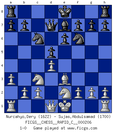 Last move : 1-0 2019 May 12 8:19:48 [Event "FICGS__CHESS__RAPID_C__000206"] [Site "FICGS"] [Date "2019.03.19"] [Round "1"] [White "Nurcahyo,Dery"] [Black "Sujas,Abdulsamad"] [Result "1-0"] [WhiteElo "1622"] [BlackElo "1700"] 1.e4 c6 2.Bc4 d5 3.exd5 cxd5 4.Bb5+ Bd7 5.Bxd7+ Qxd7 6.d4 Nc6 7.Be3 Nf6 8.Nc3 e6 9.Nge2 Be7 10.a3 1-0 This chess game has been lost on time (started : 2019.03.19 1:55:5) Caro-Kann : Hillbilly attack Player White won this chess game. Follow this game move after move (download)The defensive power of a pinned piece is only imaginary. (Aaron Nimzovich) Der Schachmeister von Heute braucht Courage, einen Killerinstinkt, Ausdauer und Arroganz. (Larry Evans) El Ajedrez es un terrible juego. Si no controlas el centro, tu oponente tiene una posición mas holgada. Si tienes control del centro, ¡entonces realmente tu tienes algo de que preocuparte!. (Siegbert Tarrasch) Je ne suis pas le dernier à jouer lâchement des coups douteux pendant le zeïtnot de l'adversaire pour l'achever: en effet les coups qui font le plus peur sont ceux que l'on ne comprend pas. Je me fais souvent peur quand je joue. (Un professeur anonyme) Wisdom doesn't necessarily come with age. Sometimes age just shows up all by itself. (Tom Watson)