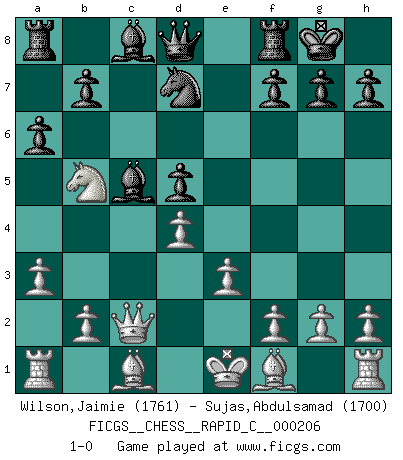 Last move : 1-0 2019 May 15 8:40:43 [Event "FICGS__CHESS__RAPID_C__000206"] [Site "FICGS"] [Date "2019.03.19"] [Round "1"] [White "Wilson,Jaimie"] [Black "Sujas,Abdulsamad"] [Result "1-0"] [WhiteElo "1761"] [BlackElo "1700"] 1.Nf3 d5 2.c4 c6 3.e3 Nd7 4.Nc3 Ngf6 5.Qc2 e5 6.cxd5 cxd5 7.Nb5 Bc5 8.Nxe5 O-O 9.Nxd7 Nxd7 10.a3 a6 11.d4 1-0 This chess game has been lost on time (started : 2019.03.19 1:55:5) Reti Opening Kingside Castling by player Black (move 8) Player White won this chess game. Follow this game move after move (download)A strong memory, concentration, imagination, and a strong will is required to become a great Chess player. (Bobby Fischer) Den Ruhm habe ich schon, jetzt brauche ich noch das Geld. (Wilhelm Steinitz) El Ajedrez es realmente noventa y nueve por ciento calculación. (Soltis) On peut tirer plus d'utilité d'une partie perdue que de 100 parties gagnées. (Capablanca) Man is still the most extraordinary computer of all. (John F. Kennedy)