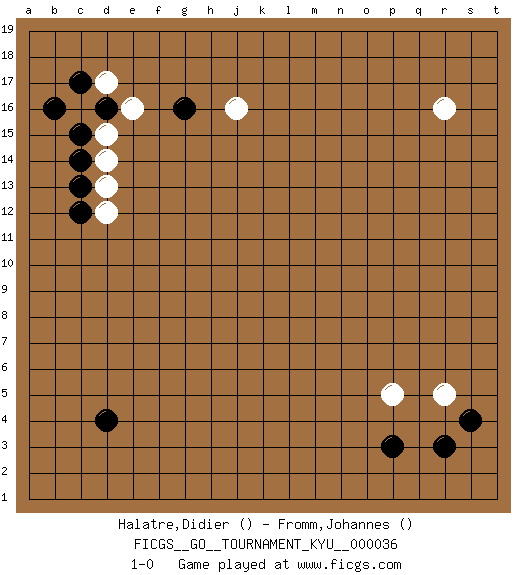 Last move : 1-0 2007 August 19 4:22:59 [Event "FICGS__GO__TOURNAMENT_KYU__000036"] [Site "FICGS"] [Date "2007.06.06"] [Round "1"] [Black "Halatre,Didier"] [White "Fromm,Johannes"] [Result "1-0"] 1.d4 r16 2.r3 c16 3.c14 r5 4.p3 p5 5.s4 e16 6.g16 d12 7.c12 d14 8.c13 d13 9.c15 d15 10.b16 j16 11.c17 d17 12.d16 1-0 This go game has been lost on time (started : 2007.06.06 13:40:50) Here are the names of the openings (joseki) played in the four corners : Corner d16 : c16 c14 Komoku (Somok, Xiao~mu`) 3-4 Point. The komoku (3-4) point is the traditional corner enclosure move.. Corner q4 : r3 r5 San-San (Sam-Sam, San-San) 3-3 Point. The San-San (3-3) point, emphasizing territory at the expense of influence. Ikken Kakari (Hankan Keolch'im, Yi Gua`, Jiao~, 1-Space Approach). Black may continue by playing 4-5, 3-5, 4-6, 3-6 or 5-4. Corner d4 : d4 1-0 Hoshi (Hwajeom, Seongjeom, Xingwei`) 4-4 Point. The star or hoshi (4-4) point, emphasizing influence at the potential expense of territory. Player Black won this Go (weiqi, baduk) game. Follow this game move after move (download)The simplest move is the best move. (Anonymous) When you stop learning you start dying. (M. Scott Adams)
