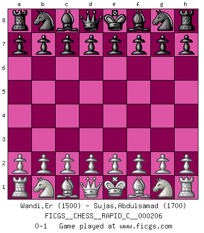 Last move : 0-1 2019 April 18 5:39:19 [Event "FICGS__CHESS__RAPID_C__000206"] [Site "FICGS"] [Date "2019.03.19"] [Round "1"] [White "Wandi,Er"] [Black "Sujas,Abdulsamad"] [Result "0-1"] [WhiteElo "1500"] [BlackElo "1700"] 0-1 This chess game has been lost on time (started : 2019.03.19 1:55:5) Player Black won this chess game. Follow this game move after move (download)Avoid the crowd. Do your own thinking independently. Be the Chess player, not the Chess piece. (Ralph Charell) Modernes Schach erfordert enorme Anspannung. Es ist für einen normalen Menschen unmöglich das auszuhalten. (Viktor Kortschnoi) El juego de Damas es para vagabundos. (Paul Morphy) Aux échecs, les retours au sommet sont rares : les dommages psychologiques consécutifs à une défaite sont trop sévères. (Daily Telegraph) There are lots of people who mistake their imagination for their memory. (Josh Bilings)