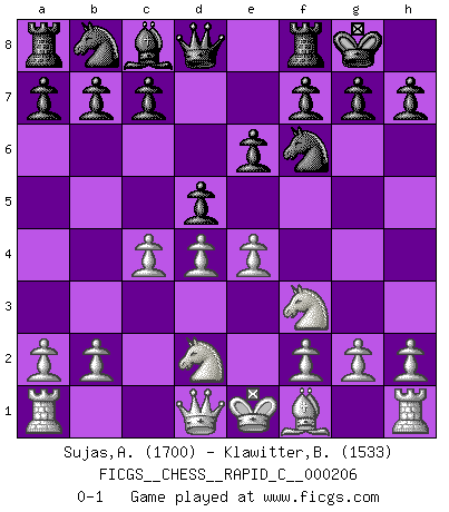 Last move : 0-1 2019 April 25 18:24:24 [Event "FICGS__CHESS__RAPID_C__000206"] [Site "FICGS"] [Date "2019.03.19"] [Round "1"] [White "Sujas,Abdulsamad"] [Black "Klawitter,Bernd"] [Result "0-1"] [WhiteElo "1700"] [BlackElo "1533"] 1.d4 Nf6 2.c4 e6 3.Nf3 Bb4+ 4.Bd2 Bxd2+ 5.Nbxd2 O-O 6.e4 d5 0-1 This chess game has been lost on time (started : 2019.03.19 1:55:5) Bogo-Indian defense Kingside Castling by player Black (move 5) Player Black won this chess game. Follow this game move after move (download)Bobby Fischer's current state of mind is indeed a tragedy. One of the world's greatest Chess players - the pride and sorrow of American Chess. (Frank Brady) Du musst nicht gut spielen, es reicht, wenn du besser spielst als dein Gegner. (Anonymous) Todos los Maestros de Ajedrez fueron un día unos principiantes. (Chernev) Un journaliste : 'Vous préférez avoir une dame de plus sur l'échiquier ou au lit ?' Boris Spassky : 'Ca dépend de la position.' Animated gif is worth one mega-word. (Unknown)