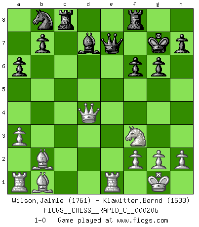 Last move : 1-0 2019 March 30 19:3:13 [Event "FICGS__CHESS__RAPID_C__000206"] [Site "FICGS"] [Date "2019.03.19"] [Round "1"] [White "Wilson,Jaimie"] [Black "Klawitter,Bernd"] [Result "1-0"] [WhiteElo "1761"] [BlackElo "1533"] 1.Nf3 Nf6 2.c4 c5 3.Nc3 e6 4.e3 Nc6 5.d4 d5 6.cxd5 Nxd5 7.Bb5 Nxc3 8.bxc3 Bd7 9.O-O cxd4 10.cxd4 Be7 11.e4 O-O 12.Bb2 a6 13.Bd3 Nb4 14.Bb1 Rc8 15.a3 Nc6 16.Qd3 g6 17.d5 exd5 18.exd5 Nb8 19.Qd4 f6 20.d6 Kg7 21.dxe7 Qxe7 22.Re1 1-0 Reti Opening Kingside Castling by player White (move 9) Kingside Castling by player Black (move 11) Player White won this chess game. Follow this game move after move (download)Fischer is the strongest player in the world. In fact, the strongest player who ever lived. (Larry Evans) Gegen einen Schachcomputer zu verlieren ist wie Löcher in den Strümpfen zuhaben. Es ist nicht peinlich, solange man der einzige ist der es weiß. (Anonymous) ¿Porque tengo que perder ante este idiota?. (Aron Nimzovich) Les échecs sont plus proches de l'art de l'assassinat que de l'art de la guerre. (Arturo Perez-Reverte) Wawaweewa ! (Borat: Cultural learnings of America for make benefit glorious nation of Kazakhstan)