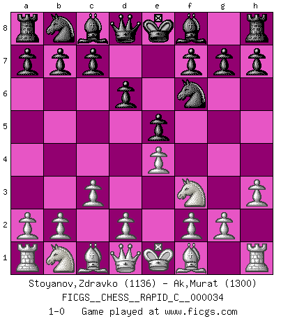 Last move : 1-0 2007 July 10 22:38:19 [Event "FICGS__CHESS__RAPID_C__000034"] [Site "FICGS"] [Date "2007.06.06"] [Round "1"] [White "Stoyanov,Zdravko"] [Black "Ak,Murat"] [Result "1-0"] [WhiteElo "1136"] [BlackElo "1300"] 1.e4 e5 2.Nf3 d6 3.h3 Nf6 4.c3 1-0 This chess game has been lost on time (started : 2007.06.06 18:2:29) Philidor's defense Player White won this chess game. Follow this game move after move (download)He who fears an isolated Queen's Pawn should give up Chess. (Siegbert Tarrasch) Wie, soll nun auch die Opposition abgeschafft werden? Ja, es tut mir leid, Ihnen diesen Schmerz nicht ersparen zu können. (Aaron Nimzowitsch) No hay precio que sea tan grande por la cabellera del Rey enemigo. (Koblentz) Il s'avisa de me proposer d'apprendre les échecs qu'il jouait un peu... me voilà forcené des échecs. J'achète un échiquier, je m'enferme dans ma chambre, j'y passe des jours et des nuits à vouloir apprendre par cur toutes les parties. (Jean-Jacques Rousseau, Confessions) The meaning of life is that it is to be lived, and it is not to be traded and conceptualized and squeezed into a pattern of systems. (Bruce Lee)