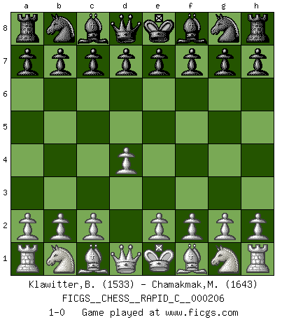 Last move : 1-0 2019 April 18 5:39:19 [Event "FICGS__CHESS__RAPID_C__000206"] [Site "FICGS"] [Date "2019.03.19"] [Round "1"] [White "Klawitter,Bernd"] [Black "Chamakmak,Meslemlahouari"] [Result "1-0"] [WhiteElo "1533"] [BlackElo "1643"] 1.d4 1-0 This chess game has been lost on time (started : 2019.03.19 1:55:5) Queen's pawn Player White won this chess game. Follow this game move after move (download)Man is a frivolous, a specious creature, and like a Chess player, cares more for the process of attaining his goal than for the goal itself. (Dostoyevsky) Fischer ist das größte Genie, das je vom Schachhimmel heruntergestiegen ist. (Mikhail Nekhemyevich Tal) Cuando tengas duda... ¡juega al Ajedrez!. (Tevis) En blitz, le Cavalier l'emporte sur le Fou. (Vlastimil Hort) A clear conscience is usually the sign of a bad memory. (Unknown)