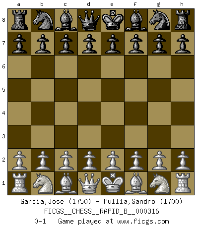 Last move : 0-1 2019 April 19 5:43:18 [Event "FICGS__CHESS__RAPID_B__000316"] [Site "FICGS"] [Date "2019.03.19"] [Round "1"] [White "Garcia,Jose"] [Black "Pullia,Sandro"] [Result "0-1"] [WhiteElo "1750"] [BlackElo "1700"] 0-1 This chess game has been lost on time (started : 2019.03.19 19:38:11) Player Black won this chess game. Follow this game move after move (download)Openings teach you openings. Endgames teach you chess ! (Stephan Gerzadowicz) Charakterschwächen offenbaren sich normalerweise während einer Schachpartie. (Garry Kasparov) Me siento como si fuera una pieza en una partida de Ajedrez, cuando mi oponente me indica: esa pieza no puede ser movida. (Soren Kierkegaard) Si je n'étais pas joueur d'échecs, je serais le meilleur dans quelque chose d'autre. (Anatoli Karpov) Perseverance does not equal worthiness. Next time you want to get my attention, wear something fun. Low-riding jeans are hot. (Gregory House, House M.D.)