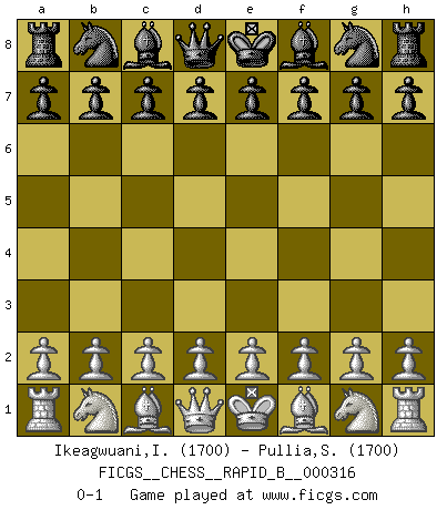 Last move : 0-1 2019 April 19 5:43:18 [Event "FICGS__CHESS__RAPID_B__000316"] [Site "FICGS"] [Date "2019.03.19"] [Round "1"] [White "Ikeagwuani,Ikechukwu"] [Black "Pullia,Sandro"] [Result "0-1"] [WhiteElo "1700"] [BlackElo "1700"] 0-1 This chess game has been lost on time (started : 2019.03.19 19:38:11) Player Black won this chess game. Follow this game move after move (download)Chess is no whit inferior to the violin, and we have a large number of professional violinists. (Mikhail Botvinnik) Wenn Du einsam bist, wenn Du Dich in der Welt wie ein Fremder fühlst, spiele Schach. Das wird Deinen Geist erheben und Dein Ratgeber im Kampf sein. (Aristoteles) Por tratar de evitar la pérdida de una pieza, muchas personas han perdido una partida de Ajedrez. (Savielly Tartakover) La conception d'un plan est le processus par lequel un joueur exploite les avantages de sa position tout en s'efforçant d'en réduire au minimum les inconvénients. Afin de garantir le succès, un plan doit toujours se fonder sur un diagnostic objectif des particularités d'une position. La conception d'un plan est d'autant plus difficile que la position est équilibrée, et grandement facilitée lorsqu'il n'existe qu'un seul plan susceptible de répondre aux exigences de la position. (Harry Golombek) Imagination is more important than knowledge. Knowledge is limited. Imagination encircles the world. (Albert Einstein)