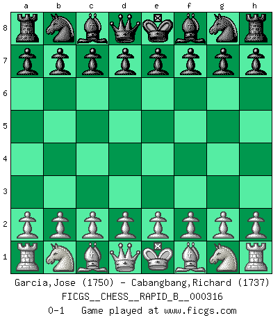 Last move : 0-1 2019 April 19 5:43:18 [Event "FICGS__CHESS__RAPID_B__000316"] [Site "FICGS"] [Date "2019.03.19"] [Round "1"] [White "Garcia,Jose"] [Black "Cabangbang,Richard"] [Result "0-1"] [WhiteElo "1750"] [BlackElo "1737"] 0-1 This chess game has been lost on time (started : 2019.03.19 19:38:11) Player Black won this chess game. Follow this game move after move (download)My God, Bobby Fischer plays so simply. (Alexei Suetin) Smyslow ist ein Beweis dafür, dass ich noch zehn Jahre spielen kann! [der 75 jährige über den 85 jährigen] (Viktor Kortschnoi) Fischer deseaba darle a los Rusos una sopa de su propia medicina. (Larry Evans) Le génie consiste à savoir transgresser les règles au moment opportun. (Teichmann) The arrogant army will lose certainly the battle. (Chinese proverb)