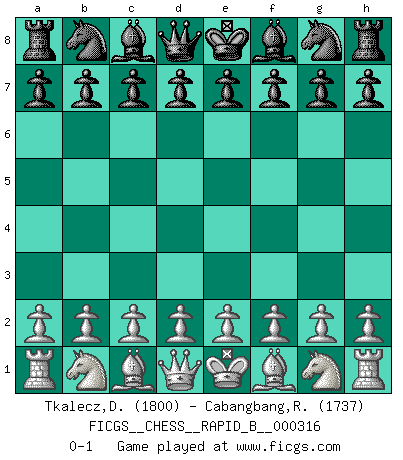 Last move : 0-1 2019 April 19 5:43:18 [Event "FICGS__CHESS__RAPID_B__000316"] [Site "FICGS"] [Date "2019.03.19"] [Round "1"] [White "Tkalecz,David Hernan"] [Black "Cabangbang,Richard"] [Result "0-1"] [WhiteElo "1800"] [BlackElo "1737"] 0-1 This chess game has been lost on time (started : 2019.03.19 19:38:11) Player Black won this chess game. Follow this game move after move (download)A man without frontiers. He didn't divide the East and the West, he brought them together in their admiration for him. (Ljubomir Ljubojevic, about Bobby Fischer's death) Es tut gut, die Entwicklungsperiode von, [...] demokratischem Geist durchdringen zu lassen. Wie undemokratisch wäre es doch beispielsweise, den einen Offizier große Spaziertouren vornehmen zu lassen, während die anderen zu Hause säßen und sich entsetzlich langweilten. (Aaron Nimzowitsch) No hay precio que sea tan grande por la cabellera del Rey enemigo. (Koblentz) A chaque perte on perd un peu de soi. (Joël Lautier) Establishing goals is all right if you don't let them deprive you of interesting detours. (Doug Larson)