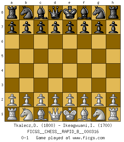 Last move : 0-1 2019 April 19 5:43:18 [Event "FICGS__CHESS__RAPID_B__000316"] [Site "FICGS"] [Date "2019.03.19"] [Round "1"] [White "Tkalecz,David Hernan"] [Black "Ikeagwuani,Ikechukwu"] [Result "0-1"] [WhiteElo "1800"] [BlackElo "1700"] 0-1 This chess game has been lost on time (started : 2019.03.19 19:38:11) Player Black won this chess game. Follow this game move after move (download)Look at Garry Kasparov. After he loses, invariably he wins the next game. He just kills the next guy. That's something that we have to learn to be able to do. (Maurice Ashley) Ein Schachgenie ist jemand der verdammt gut Schach spielt. (Jonathan Levitt) Todo lo que importa ante el tablero de Ajedrez son buenas jugadas. (Bobby Fischer) Il n'y a pas eu de défaite parce que je ne crois pas que cet ordinateur ait jamais existé. IBM a triché en refusant d'imprimer les modes de recherche de la machine. C'est évident, pendant le match, des coups décisifs ont été joués par des êtres humains. Aujourd'hui, les meilleurs spécialistes en informatique ne peuvent toujours pas expliquer comment Deep-Blue a pu jouer contre la logique des ordinateurs. IBM a gagné une guerre de communication, mais ils sont incapables de prouver que l'ordinateur a gagné tout seul. (Garry Kasparov) Life is pleasant. Death is peaceful. It's the transition that's troublesome. (Isaac Asimov)
