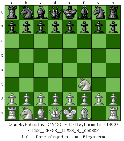 Last move : 1-0 2019 May 3 19:16:53 [Event "FICGS__CHESS__CLASS_B__000302"] [Site "FICGS"] [Date "2019.03.24"] [Round "1"] [White "Czudek,Bohuslav"] [Black "Cella,Carmelo"] [Result "1-0"] [WhiteElo "1942"] [BlackElo "1800"] 1.Nf3 1-0 This chess game has been lost on time (started : 2019.03.24 7:16:5) Reti Opening Player White won this chess game. Follow this game move after move (download)Why must I lose to this idiot ? (Aron Nimzovich) Der Freibauer hat für mich eine Seele, genau wie der Mensch, Wünsche, die unerkannt in ihm schlummern, und Befürchtungen, von deren Existenz er selbst kaum ahnt. (Aaron Nimzowitsch) Los Peones son el alma de una partida de Ajedrez. (Francois Andre Danican Philidor) Il (Jacob Murray) ne joue pas pour le bon coup, mais pour le meilleur. (Eloi Relange) It is not titles that honor men, but men that honor titles. (Niccolo Machiavelli)