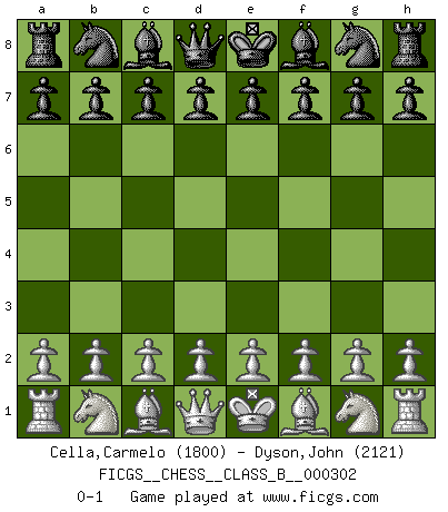 Last move : 0-1 2019 May 3 19:16:53 [Event "FICGS__CHESS__CLASS_B__000302"] [Site "FICGS"] [Date "2019.03.24"] [Round "1"] [White "Cella,Carmelo"] [Black "Dyson,John"] [Result "0-1"] [WhiteElo "1800"] [BlackElo "2121"] 0-1 This chess game has been lost on time (started : 2019.03.24 7:16:5) Player Black won this chess game. Follow this game move after move (download)Good positions don't win games, good moves do. (Gerald Abrahams) Die meiste Zeit treffe ich auf Gegner, die meine Enkel sein könnten. Ich bin da, um ihnen zu zeigen, dass sie von mir noch einiges lernen können. (Viktor Kortschnoi) Los libros de Ajedrez deben de usarse igual como usamos los anteojos: para mejorar la vista, aunque algunos jugadores los quieren usar como si ellos les otorgaran la vision. (José Raúl Capablanca) Le joueur d'Echecs qui veut atteindre le top est obligé de développer son propre credo créatif. Alexeï Stepanovicth Souétine. Il est facile d'écrire des livres ! Ce qui est difficile, c'est de jouer ! (Alexeï Stepanovicth Souétine) The only difference between a tax man and a taxidermist is that the taxidermist leaves the skin. (Mark Twain)