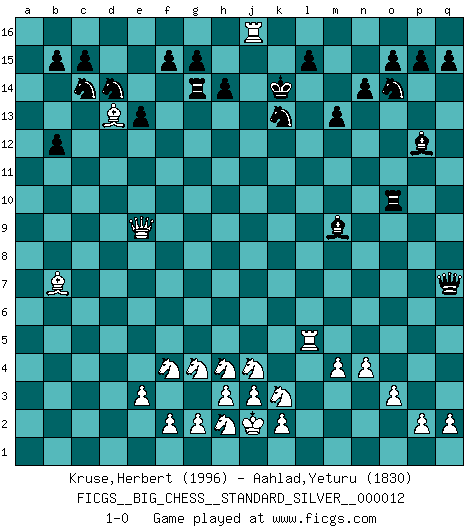 Last move : 1-0 2019 May 10 18:26:51 [Event "FICGS__BIG_CHESS__STANDARD_SILVER__000012"] [Site "FICGS"] [Date "2019.03.24"] [Round "2"] [White "Kruse,Herbert"] [Black "Aahlad,Yeturu"] [Result "1-0"] [WhiteElo "1996"] [BlackElo "1830"] 1.m2-m4 j15-k13 2.p1-o3 h16-o10 3.h2-g4 h15-g13 4.l1-m2 o10-c10 5.b1-c3 c10-l2 6.m1-l1 l2-c10 7.n2-n4 m15-m13 8.o1-k5 l16-p12 9.k5-j4 c10-e10 10.j2-h4 p16-o14 11.j4-k5 e10-g10 12.k5-l6 g10-j10 13.l1-l5 n15-n14 14.l5-j5 j10-k9 15.l6-j8 k9-a9 16.k1-h2 o16-f8 17.j5-p5 f8-m2 18.o3-m2 m16-m14 19.h1-m5 b16-c14 20.d2-d3 m14-l14 21.c1-h6 e15-e13 22.g1-j2 a15-a13 23.e2-e3 f16-b12 24.h6-b12 a13-b12 25.j2-l3 g16-f14 26.f1-e2 d15-d13 27.e2-f3 c16-l8 28.m2-k3 f14-e12 29.j1-j2 a16-a10 30.e1-l1 q16-m16 31.l3-j4 l8-m9 32.l1-l14 k16-l14 33.q1-l1 e16-e14 34.l1-l5 e14-f14 35.a1-l1 a10-f10 36.l5-a5 a9-b9 37.l1-l14 k15-l14 38.a5-a16 j16-h15 39.a16-m16 b9-b2 40.m5-a5 b2-c2 41.a5-a16 h15-g14 42.c3-d5 e12-d14 43.j8-d13 f10-o10 44.o2-o3 c2-d3 45.a16-j16 g14-h13 46.j16-l14 d3-a3 47.d5-f4 a3-a2 48.f3-b7 h13-g14 49.l14-j16 g13-h15 50.p5-g5 g14-f13 51.j16-h15 f14-g14 52.g5-f5 f13-g13 53.h15-j14 a2-l12 54.j14-f11 g13-h12 55.f5-l5 l12-q7 56.f11-h9 h12-j13 57.m16-j16 j13-k14 58.h9-e9 1-0 Follow this game move after move (download)Alekhine is a poet who creates a work of art out of something that would hardly inspire another man to send home a picture post card. (Max Euwe) Es ist peinlich, dass ich nie Weltmeister wurde. Es wäre leicht, Leonid Breschnjew als Ursache vorzuschieben, dessen Apparat den Vorzeigekommunisten Anatoli Karpow in allem unterstützte. Aber Garri Kasparow zum Beispiel, der ebenfalls von den Sowjets unerwünscht war, hat trotz der Widerstände den WM-Titel erobert. (Viktor Kortschnoi) El Ajedrez es imaginación. (David Bronstein) Dieu déplace le joueur, et celui-ci la pièce. Quel Dieu derrière Dieu commence donc la trame ? Arturo Perez-Reverte (prix de littérature policière 1993). No, I am still playing. (Anatoly Karpov)