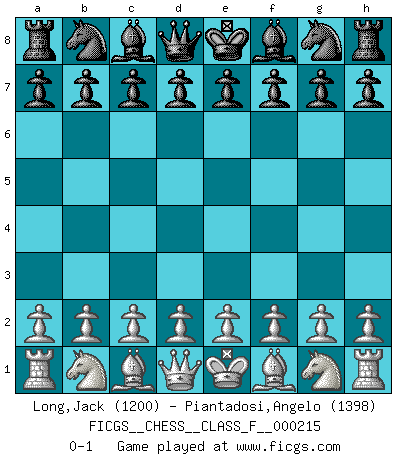 Last move : 0-1 2019 May 9 19:46:19 [Event "FICGS__CHESS__CLASS_F__000215"] [Site "FICGS"] [Date "2019.03.30"] [Round "1"] [White "Long,Jack"] [Black "Piantadosi,Angelo"] [Result "0-1"] [WhiteElo "1200"] [BlackElo "1398"] 0-1 This chess game has been lost on time (started : 2019.03.30 11:1:49) Player Black won this chess game. Follow this game move after move (download)When in doubt... play Chess ! (Tevis) Die westlichen Werte sind eine Sprache, welche die Putin-Administration nicht versteht. (Garry Kasparov) El Ajedrez es como la guerra en un tablero. (Bobby Fischer) C'est la seule position que je connaisse où les deux camps sont mals. Propos prêtés à V. Anand. Think like a man of action, act like a man of thought. (Henri Louis Bergson)