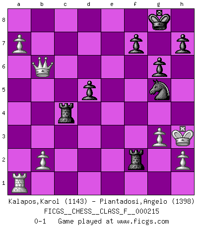 Last move : 0-1 2019 May 7 3:2:0 [Event "FICGS__CHESS__CLASS_F__000215"] [Site "FICGS"] [Date "2019.03.30"] [Round "1"] [White "Kalapos,Karol"] [Black "Piantadosi,Angelo"] [Result "0-1"] [WhiteElo "1143"] [BlackElo "1398"] 1.Nf3 d5 2.g3 e6 3.d4 Nf6 4.Bg2 c5 5.e3 Nc6 6.c3 Be7 7.O-O O-O 8.Qe2 b6 9.a4 Bb7 10.Nbd2 Rc8 11.Re1 Re8 12.e4 dxe4 13.Nxe4 Nxe4 14.Qxe4 Na5 15.Qc2 cxd4 16.Nxd4 Bxg2 17.Kxg2 Bf6 18.Rd1 Bxd4 19.Rxd4 Qxd4 20.Qe2 Nb3 21.cxd4 Nxc1 22.Qa6 Rc2 23.Qxa7 Nb3 24.Rb1 Rec8 25.Qxb6 Nd2 26.Ra1 g6 27.a5 Ne4 28.d5 exd5 29.a6 Rxf2+ 30.Kh3 Rc4 31.a7 Ng5+ 0-1 Reti : King's Indian attack (Barcza system) Kingside Castling by player White (move 7) Kingside Castling by player Black (move 7) Player Black won this chess game. Follow this game move after move (download)There is no remorse like the remorse of Chess. (H. G. Wells) Spielt Blackmar-Diemer-Gambit, und das Matt kommt von selbst! (Emil Joseph Diemer) El jugador blanco perdió porque fallo en recordar la coreccta continuación y tuvo que pensar por sí mismo las movidas. (Siegbert Tarrasch) Les échecs sont un jeu par leur forme, un art par leur essence et une science par sa difficulté d'acquisition. Ils peuvent vous procurer autant de plaisir qu'un bon livre ou une belle musique, mais vous n'aurez une réelle joie que si vous arrivez à bien jouer. (Tigran Petrosian) Every vice is only an exaggeration of a necessary and virtuous function. (Ralph Waldo Emerson, Journals 1936)