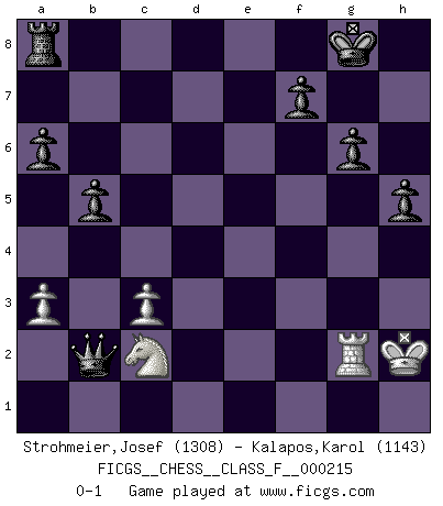 Last move : 0-1 2019 June 29 10:25:49 [Event "FICGS__CHESS__CLASS_F__000215"] [Site "FICGS"] [Date "2019.03.30"] [Round "1"] [White "Strohmeier,Josef"] [Black "Kalapos,Karol"] [Result "0-1"] [WhiteElo "1308"] [BlackElo "1143"] 1.e4 c5 2.Nf3 d6 3.d4 cxd4 4.Nxd4 Nf6 5.Nc3 a6 6.Bg5 e5 7.Nb3 Be7 8.Be2 Nbd7 9.Qd2 h6 10.Bxf6 Nxf6 11.O-O b6 12.f3 Bb7 13.Rad1 O-O 14.Qe3 Qc7 15.Rd2 Rfd8 16.Rfd1 Nh5 17.g3 Bg5 18.f4 exf4 19.Qf3 g6 20.Nd4 fxg3 21.hxg3 Bxd2 22.Rxd2 d5 23.exd5 Qxg3+ 24.Qg2 Qe1+ 25.Bf1 Nf4 26.Qf2 Nh3+ 27.Kg2 Nxf2 28.Rxf2 b5 29.a3 Rxd5 30.Nxd5 Bxd5+ 31.Kg1 Qe3 32.c3 h5 33.Nc2 Qg5+ 34.Bg2 Bxg2 35.Rxg2 Qc1+ 36.Kh2 Qxb2 0-1 Sicilian : Najdorf, 6.Bg5 Kingside Castling by player White (move 11) Kingside Castling by player Black (move 13) Player Black won this chess game. Follow this game move after move (download)Chess is in its essence a game, in its form an art, and in its execution a science. (Baron Tassilo) Jeder weiß, dass Gasprom Putins persönliches Machtinstrument ist. Die Firma wird vom Kreml aus geleitet und wird schon deshalb nie transparent sein. (Garry Kasparov) Los finales de Peón son del Ajedrez lo que el cesped es del Golf. (Cecil Purdy) Je menace de comprendre la position. (Anonyme) Thus, what is of supreme importance in war is to attack the enemy's strategy. (Sun Tzu)