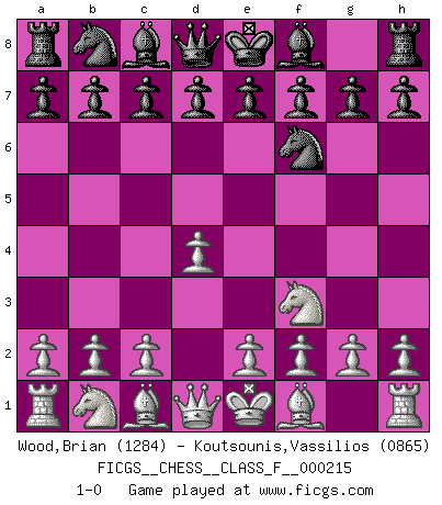 Last move : 1-0 2019 May 13 8:28:14 [Event "FICGS__CHESS__CLASS_F__000215"] [Site "FICGS"] [Date "2019.03.30"] [Round "1"] [White "Wood,Brian"] [Black "Koutsounis,Vassilios"] [Result "1-0"] [WhiteElo "1284"] [BlackElo "0865"] 1.d4 Nf6 2.Nf3 1-0 This chess game has been lost on time (started : 2019.03.30 11:1:49) Queen's pawn game Player White won this chess game. Follow this game move after move (download)The defensive power of a pinned piece is only imaginary. (Aaron Nimzovich) Früher wurde jeder komplizierte Zug, jedes interessante Opfer mit großem Beifall und Enthusiasmus aufgenommen. Heute schaltet man einfach seinen Fritz an, und man kann sehen, was los ist, ob der Zug geht oder nicht. (Vladimir Kramnik) Jugadores de primera clase pierden en contra de jugadores de segunda clase porque los jugadores de segunda clase a veces juegan una partida de primer clase. (Siegbert Tarrasch) Mais n'est-ce pas déjà le limiter injurieusement que d'appeler les échecs un jeu? N'est-ce pas aussi une science, un art, ou quelque chose qui, comme le cercueil de Mahomet entre ciel et terre, est suspendu entre l'un et l'autre, et qui réunit un nombre incroyable de contraires ? (Stefan Zweig) Political correctness is subjecting us to gross incompetence. (Johann Piek)