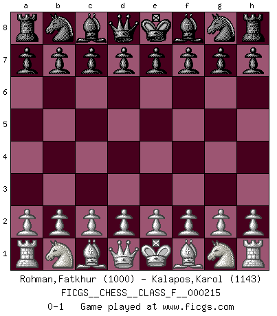 Last move : 0-1 2019 May 9 19:46:19 [Event "FICGS__CHESS__CLASS_F__000215"] [Site "FICGS"] [Date "2019.03.30"] [Round "1"] [White "Rohman,Fatkhur"] [Black "Kalapos,Karol"] [Result "0-1"] [WhiteElo "1000"] [BlackElo "1143"] 0-1 This chess game has been lost on time (started : 2019.03.30 11:1:49) Player Black won this chess game. Follow this game move after move (download)A bad day of Chess is better than any good day at work. (Anonymous) Jeder Fehler erscheint unglaublich dumm, wenn andre ihn begehen. (Georg Christoph Lichtenberg) El Ajedrez es el arte del análisis. (Mikhail Botvinnik) La guerre est enfant de la passion, la passion est enfant du narcissisme et le narcissisme est l'enfant. (...) Une autre partie ? (Thibault de Vassal) The next best thing to gambling and winning is gambling and loosing. (Nick Dandalos)