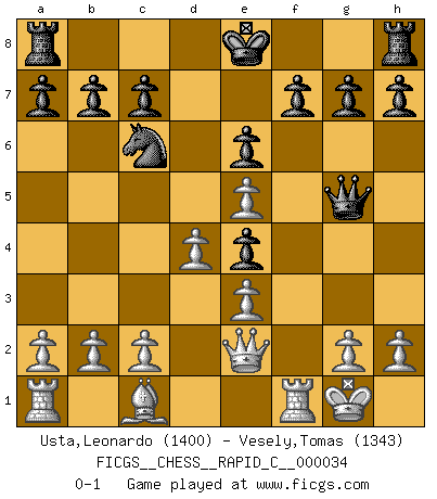 Last move : 0-1 2007 July 21 18:13:25 [Event "FICGS__CHESS__RAPID_C__000034"] [Site "FICGS"] [Date "2007.06.06"] [Round "1"] [White "Usta,Leonardo"] [Black "Vesely,Tomas"] [Result "0-1"] [WhiteElo "1400"] [BlackElo "1343"] 1.d4 d5 2.e3 Nf6 3.Nf3 Bg4 4.Be2 e6 5.Ne5 Bxe2 6.Qxe2 Bd6 7.f4 Bxe5 8.fxe5 Ne4 9.Nd2 Nc6 10.Nxe4 dxe4 11.O-O Qg5 0-1 This chess game has been lost on time (started : 2007.06.06 18:2:29) Queen's pawn game Kingside Castling by player White (move 11) Player Black won this chess game. Follow this game move after move (download)One of these modest little moves may be more embarrassing to your opponent than the biggest threat. (Siegbert Tarrasch) Schach ist mein Leben, meine Leidenschaft, was ich gelernt habe und seit meinem 14. Lebensjahr profimässig praktiziere. Darauf zu verzichten, würde mir sehr schwer fallen. (Viktor Kortschnoi) Nos gusta pensar. (Gary Kasparov) Il vaut mieux sacrifier les pièces de l'adversaire. (Xavier Tartacover) If passion drives you, let reason holds the reins. (Benjamin Franklin)