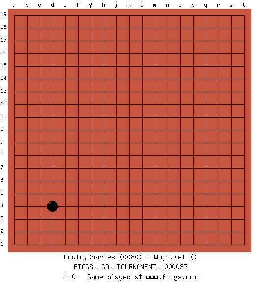 Last move : 1-0 2019 May 1 19:12:4 [Event "FICGS__GO__TOURNAMENT__000037"] [Site "FICGS"] [Date "2019.03.30"] [Round "1"] [Black "Couto,Charles"] [White "Wuji,Wei"] [Result "1-0"] [Rating 1 "0080"] 1.d4 1-0 This go game has been lost on time (started : 2019.03.30 21:12:27) Here are the names of the openings (joseki) played in the four corners : Corner d4 : d4 1-0 Hoshi (Hwajeom, Seongjeom, Xingwei`) 4-4 Point. The star or hoshi (4-4) point, emphasizing influence at the potential expense of territory. Player Black won this Go (weiqi, baduk) game. Follow this game move after move (download)The possibility or impossibility of an event results logically from the rules. (Pierre Audouard) The weakness of an artist is dogma. (Josh Waitzkin)