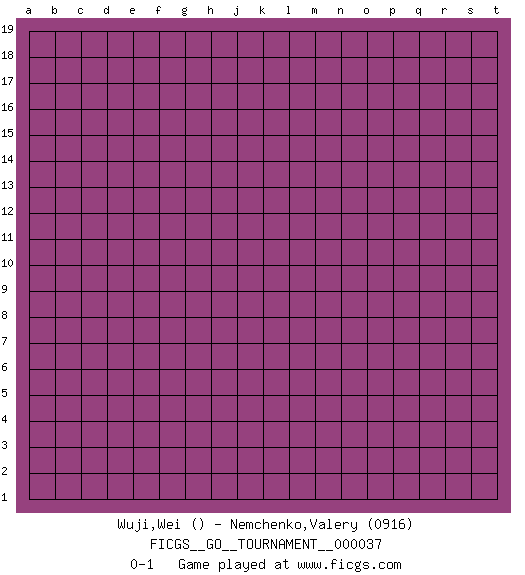 Last move : 0-1 2019 April 30 6:50:26 [Event "FICGS__GO__TOURNAMENT__000037"] [Site "FICGS"] [Date "2019.03.30"] [Round "1"] [Black "Wuji,Wei"] [White "Nemchenko,Valery"] [Result "0-1"] [Rating 2 "0916"] 0-1 This go game has been lost on time (started : 2019.03.30 21:12:27) Here are the names of the openings (joseki) played in the four corners : Player White won this Go (weiqi, baduk) game. Follow this game move after move (download)Corner, side, centre. (Anonymous) That's absurd. I love it. (Gregory House, House M.D.)