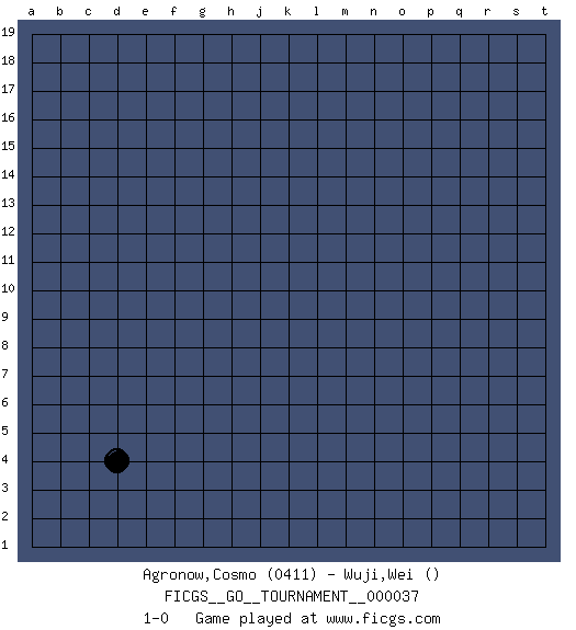 Last move : 1-0 2019 April 30 6:50:26 [Event "FICGS__GO__TOURNAMENT__000037"] [Site "FICGS"] [Date "2019.03.30"] [Round "1"] [Black "Agronow,Cosmo"] [White "Wuji,Wei"] [Result "1-0"] [Rating 1 "0411"] 1.d4 1-0 This go game has been lost on time (started : 2019.03.30 21:12:27) Here are the names of the openings (joseki) played in the four corners : Corner d4 : d4 1-0 Hoshi (Hwajeom, Seongjeom, Xingwei`) 4-4 Point. The star or hoshi (4-4) point, emphasizing influence at the potential expense of territory. Player Black won this Go (weiqi, baduk) game. Follow this game move after move (download)Keep inessential ataris till the end. (Anonymous) The best weapon against an enemy is another enemy. (Friedrich Nietzsche)