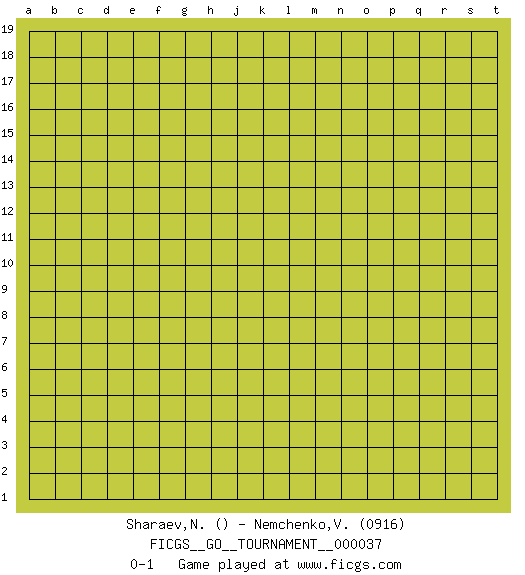 Last move : 0-1 2019 April 30 6:50:26 [Event "FICGS__GO__TOURNAMENT__000037"] [Site "FICGS"] [Date "2019.03.30"] [Round "1"] [Black "Sharaev,Nickita"] [White "Nemchenko,Valery"] [Result "0-1"] [Rating 2 "0916"] 0-1 This go game has been lost on time (started : 2019.03.30 21:12:27) Here are the names of the openings (joseki) played in the four corners : Player White won this Go (weiqi, baduk) game. Follow this game move after move (download)Connect with good shape. (Anonymous) Computers have lots of memory but no imagination. (Anonymous)